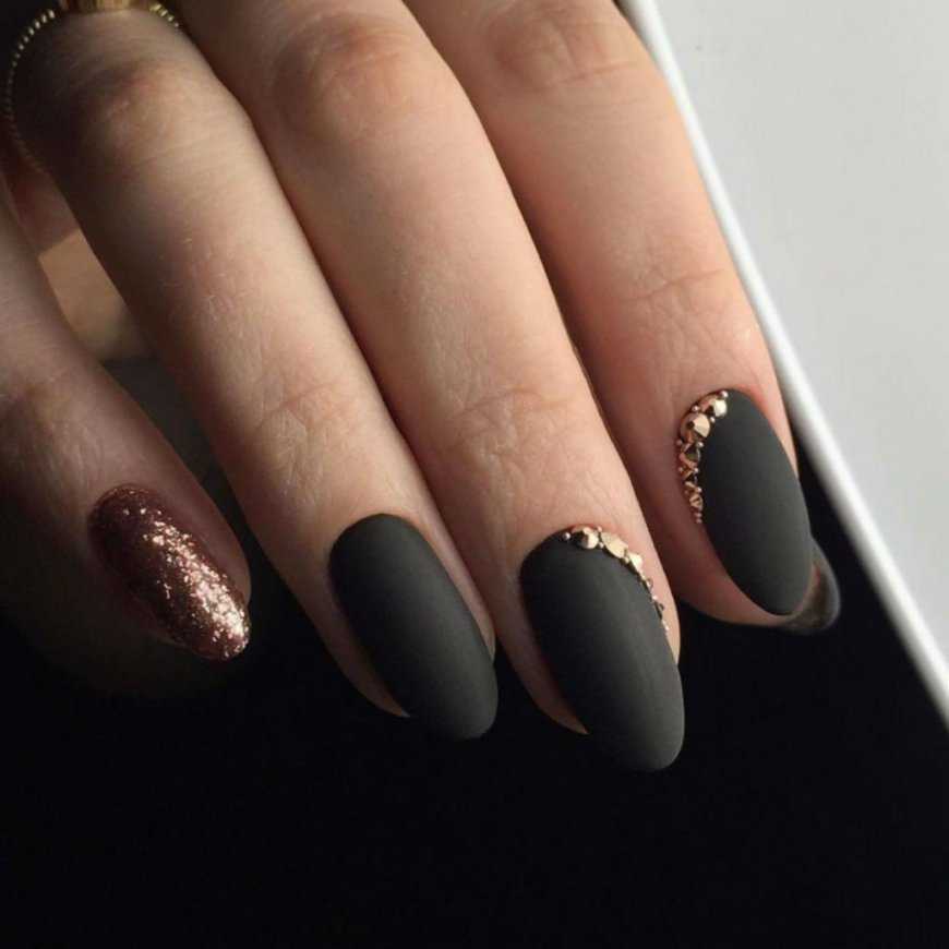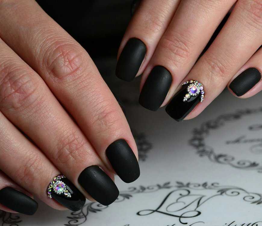 Черный маникюр отлично подчеркнут стразы, блестки и пайетки. Их обычно наносят на несколько ногтей, но вы можете добавить их на все