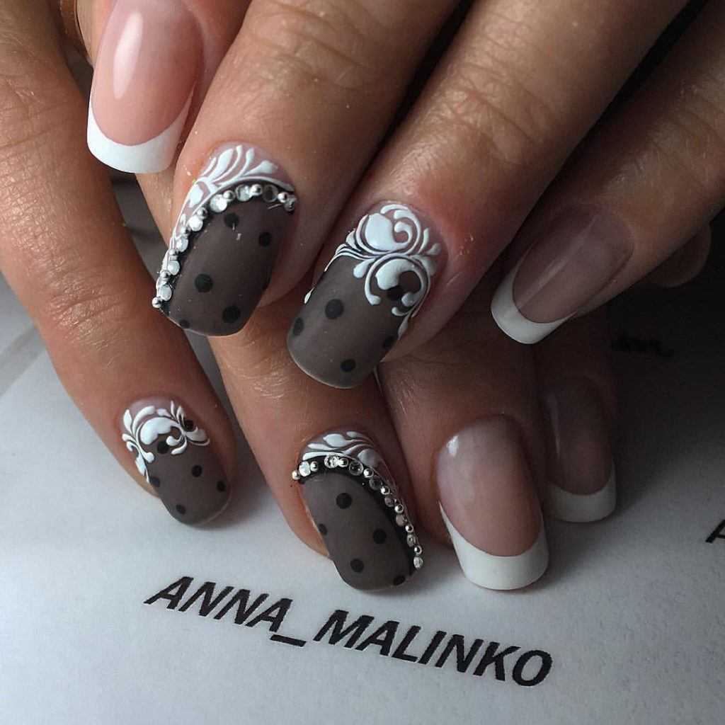 Простая черно-белая отделка позволяет создать простой, незамысловатый маникюр на каждый день. Вы можете использовать драгоценные камни, светлые принты, узоры и блестки. Однако помните, что ногти должны быть небольшими, чтобы не переусердствовать.