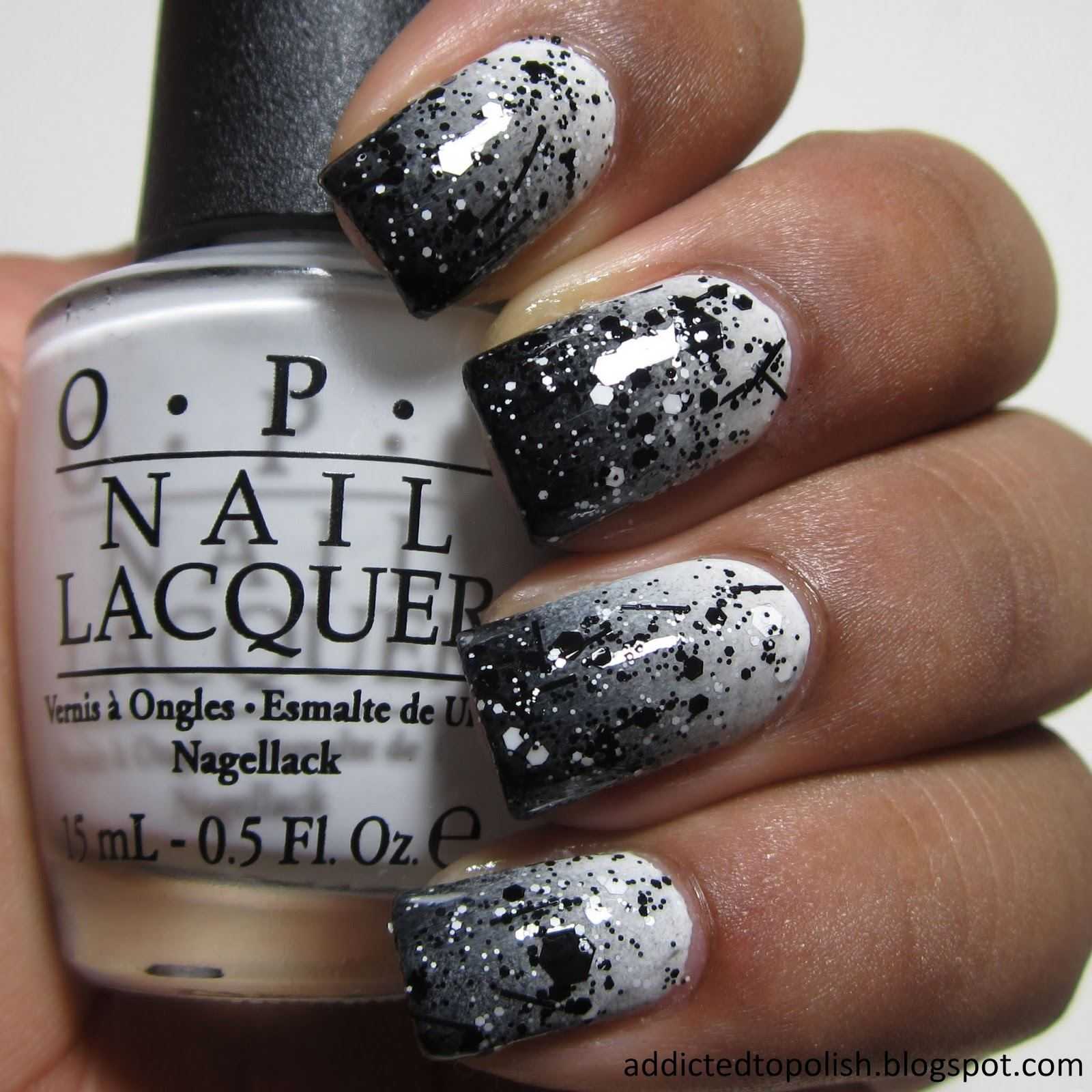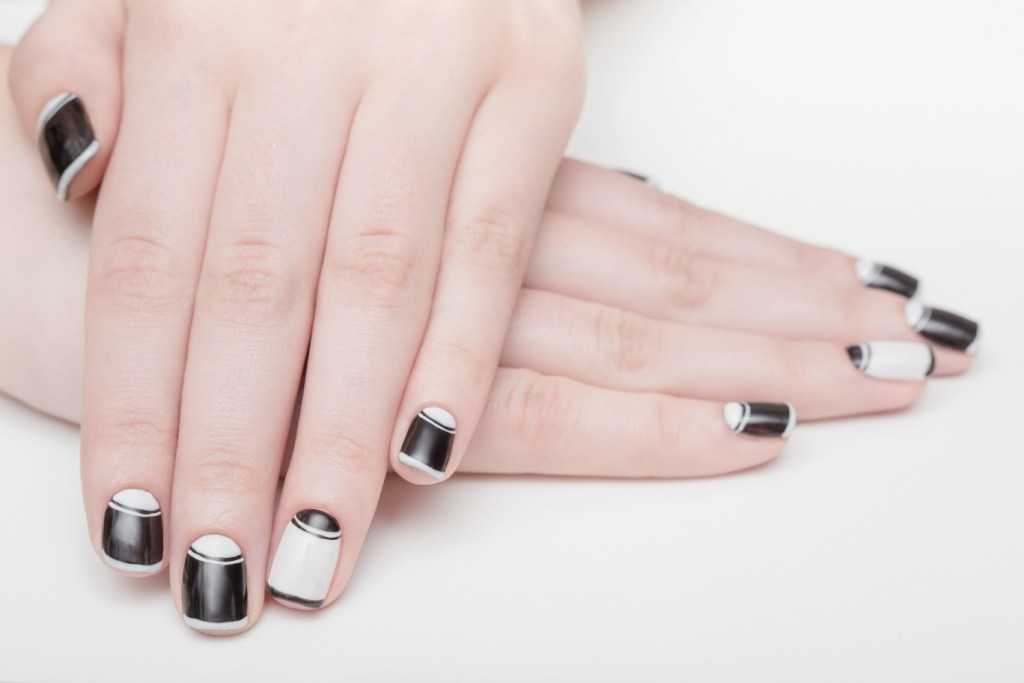 Простое и оригинальное решение – сделать дизайн, используя черный лак для ногтей с одной стороны и белый лак для ногтей с другой.