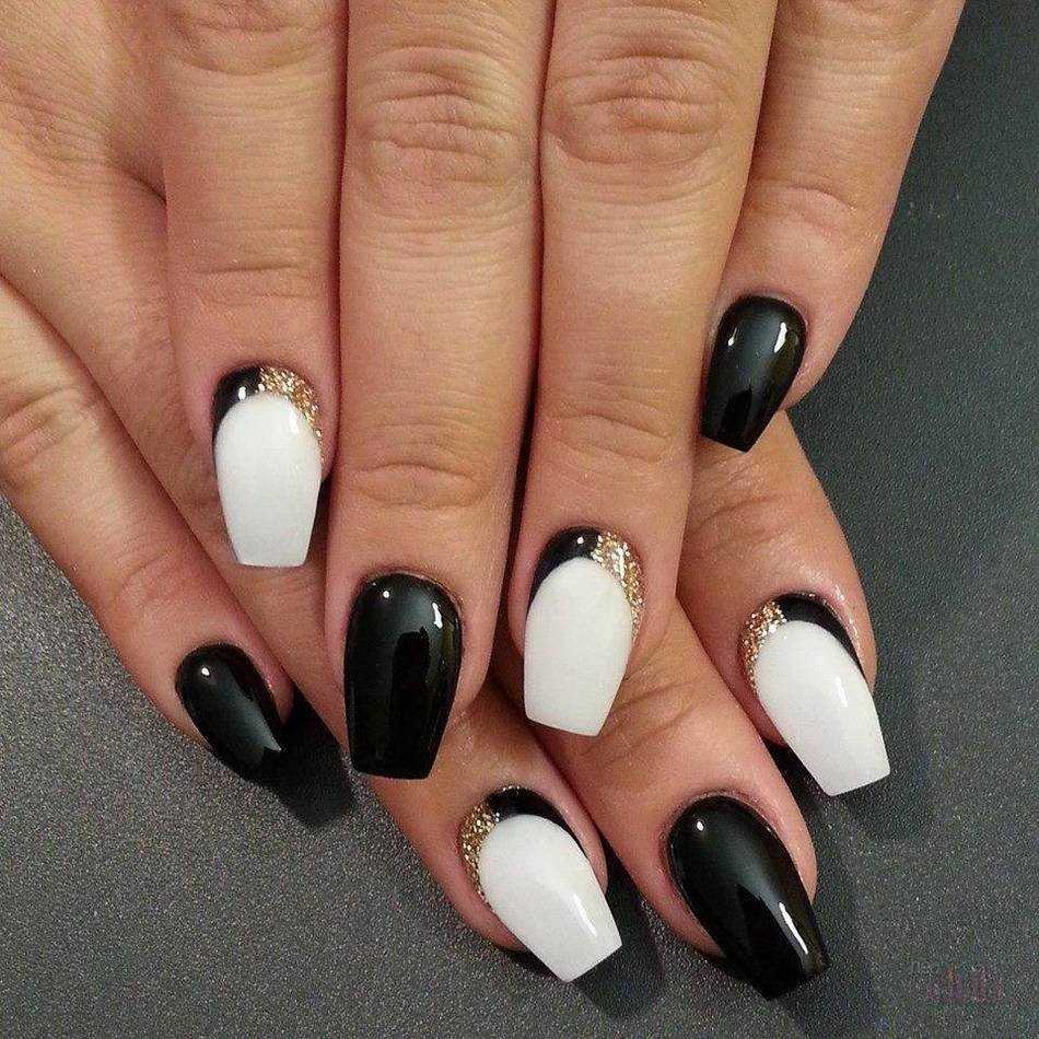 Идея дополнить черно-белые ногти серебряными или золотыми деталями считается одной из самых популярных в области дизайна ногтей. Это решение позволяет сгладить контраст между цветами и выглядит просто потрясающе. Можно применять различные декоративные элементы, поэтому разнообразие вариаций этого дизайна впечатлит любую юную леди.