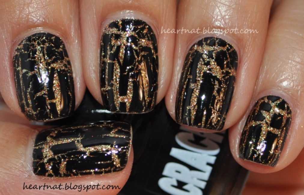 Создает эффект потрескавшейся фрески. В данной технике нужно использовать специальные лаки. Их особенность заключается в том, что после нанесения лак трескается, создавая оригинальный орнамент на ногтях. Перед нанесением необходимо подобрать цвет-основу. Именно он и будет проявляться в трещинах верхнего слоя. Черный кракелюр особенно интересен в сочетании с контрастным цветом.