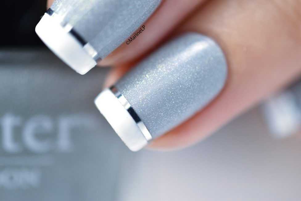 Серебро наносят не сколько на пальцы, а только на один безымянный. По середине делают серебристую полоску, уместны также геометрические фигуры. Возможно использование глиттера и камушков мелкого размера.