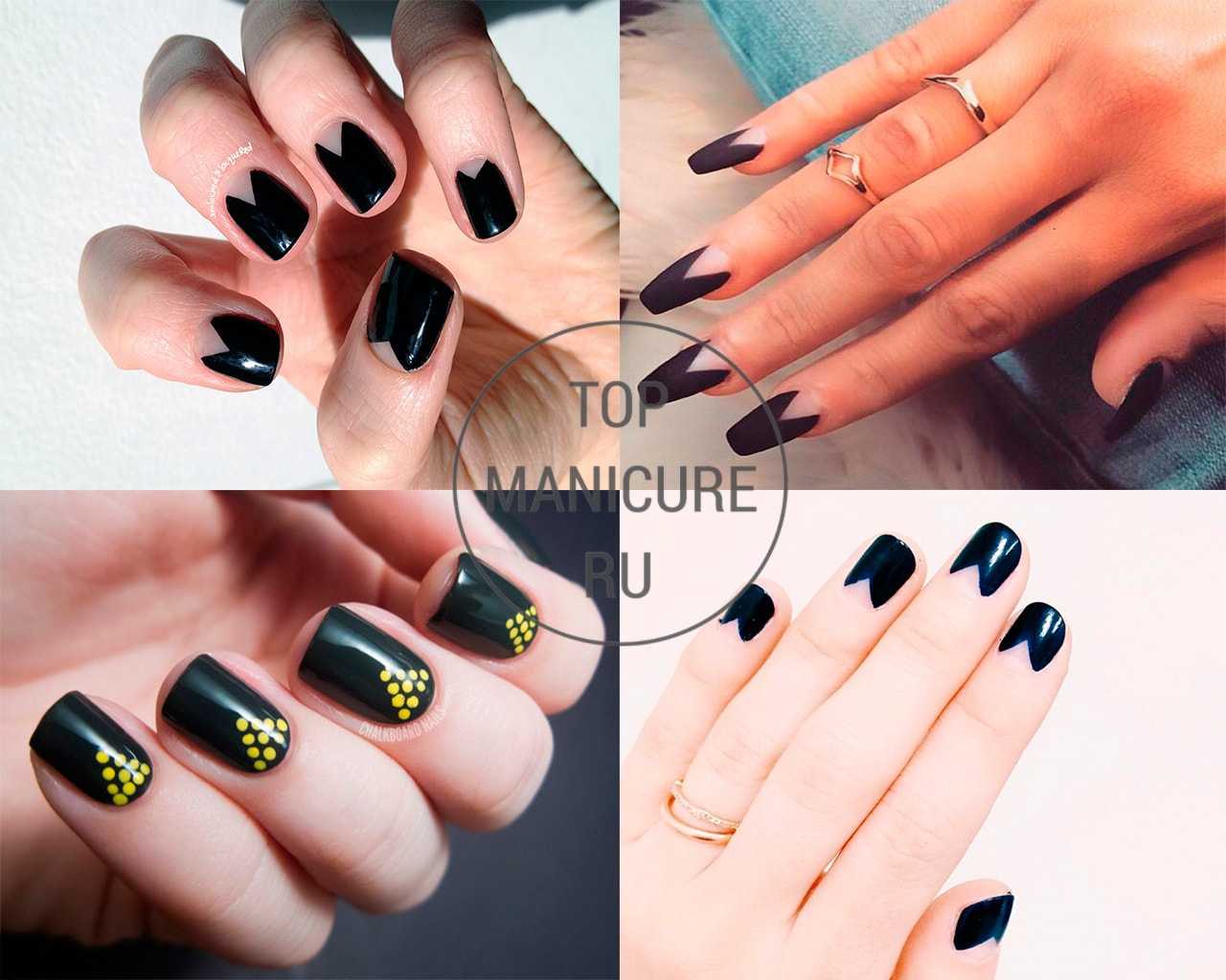 Также интересным решением будет черный маникюр с треугольными лунками. Вместо закругленного трафарета в нем используется трафарет треугольной формы. Лунка закрывается трафаретом, и ногти окрашиваются в черный цвет. Затем трафарет убирается, и мы получаем треугольные лунки на ногтях. Нужно отметить, что на фото 3 выполнен дизайн в стиле треугольной лунки, но сделан он с помощью нанесения желтых точек на черные ногти.