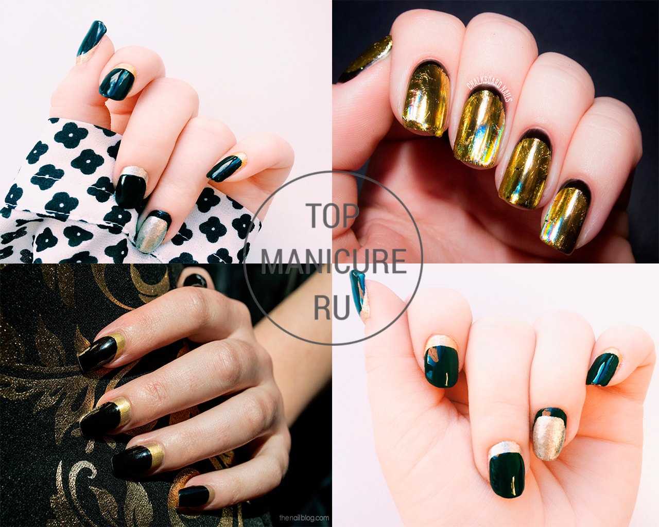 Здесь мы видим лунный черный маникюр с золотом. В первом случае вместо лака для дизайна лунок используются золотые блестки, а между лункой и основным цветом ногтя оставлено незакрашенное пространство. Также ногти украшены красивым металлическим аксессуаром. Во втором случае используется блестящий металлический лак и матовый черный, получается очень яркий контраст.