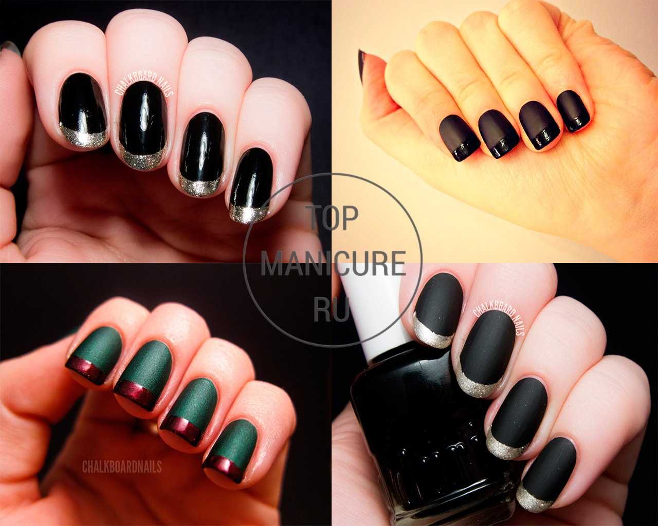 2. На этом же фото представлен матовый черный квадратный френч на коротких ногтях. Сделать такой еще проще. Нам нужно закрыть липкой лентой большую часть ногтя, оставив при этом кончик, который мы и покроем черным глянцевым лаком, получив контраст блеска и матового покрытия.