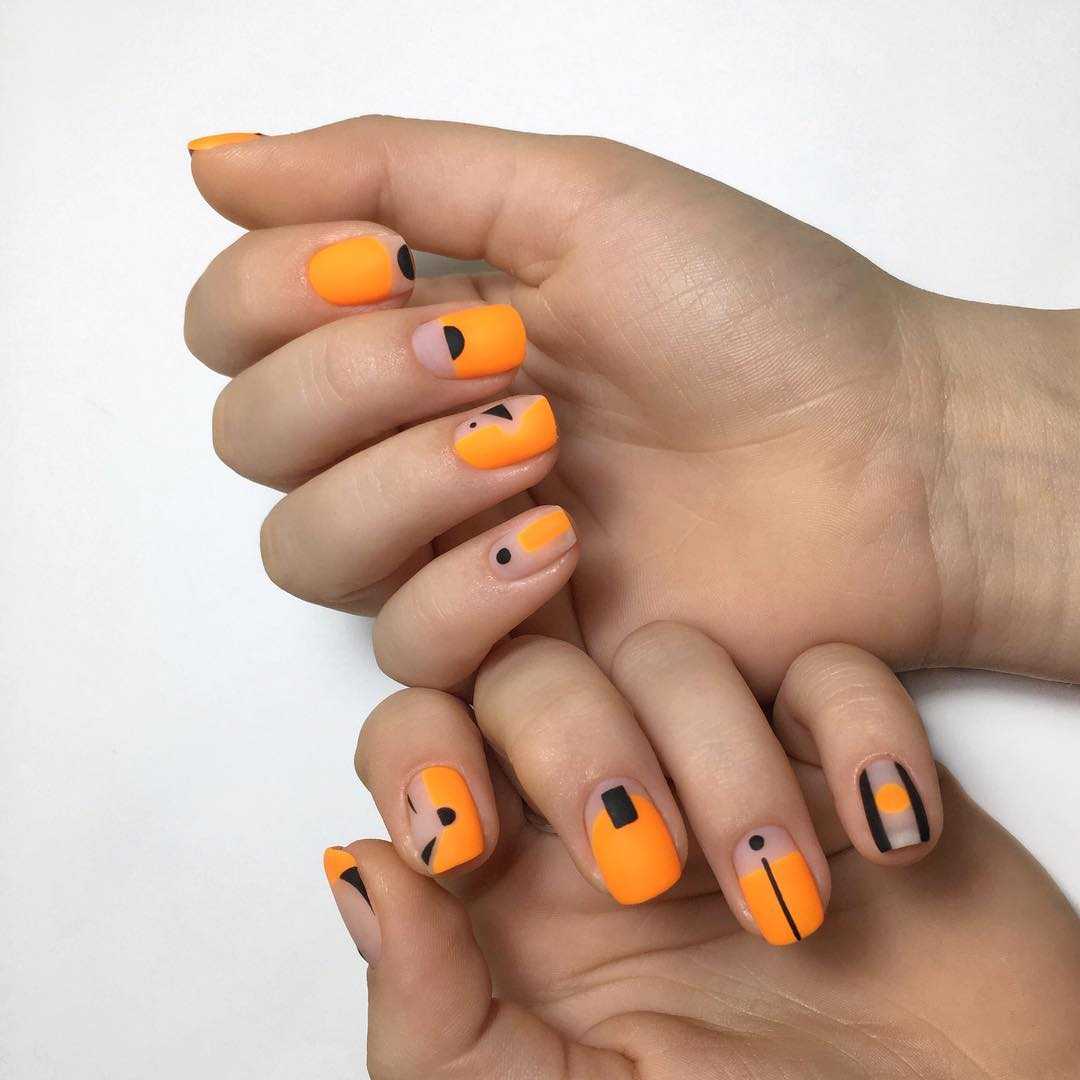 Трендовый оранжевый может быть не только приглушенных тонов. Яркие неоновые покрытия красиво смотрятся с надписями и нейл-рисунками черного цвета. Данное покрытие может быть сплошным или комбинированным с прозрачным лаком. Оранжевый допустимо сочетать с другими цветами, если это подразумевает дизайн.