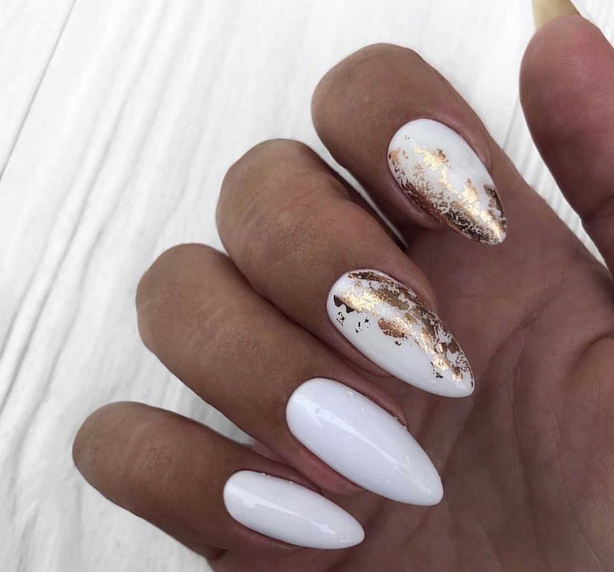 Довольно эффектно и необычно на коротких овальных ногтях будет смотреться такой популярный вариант дизайна как кракелюр из фольги или мраморный маникюр.