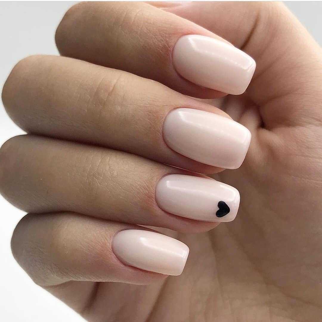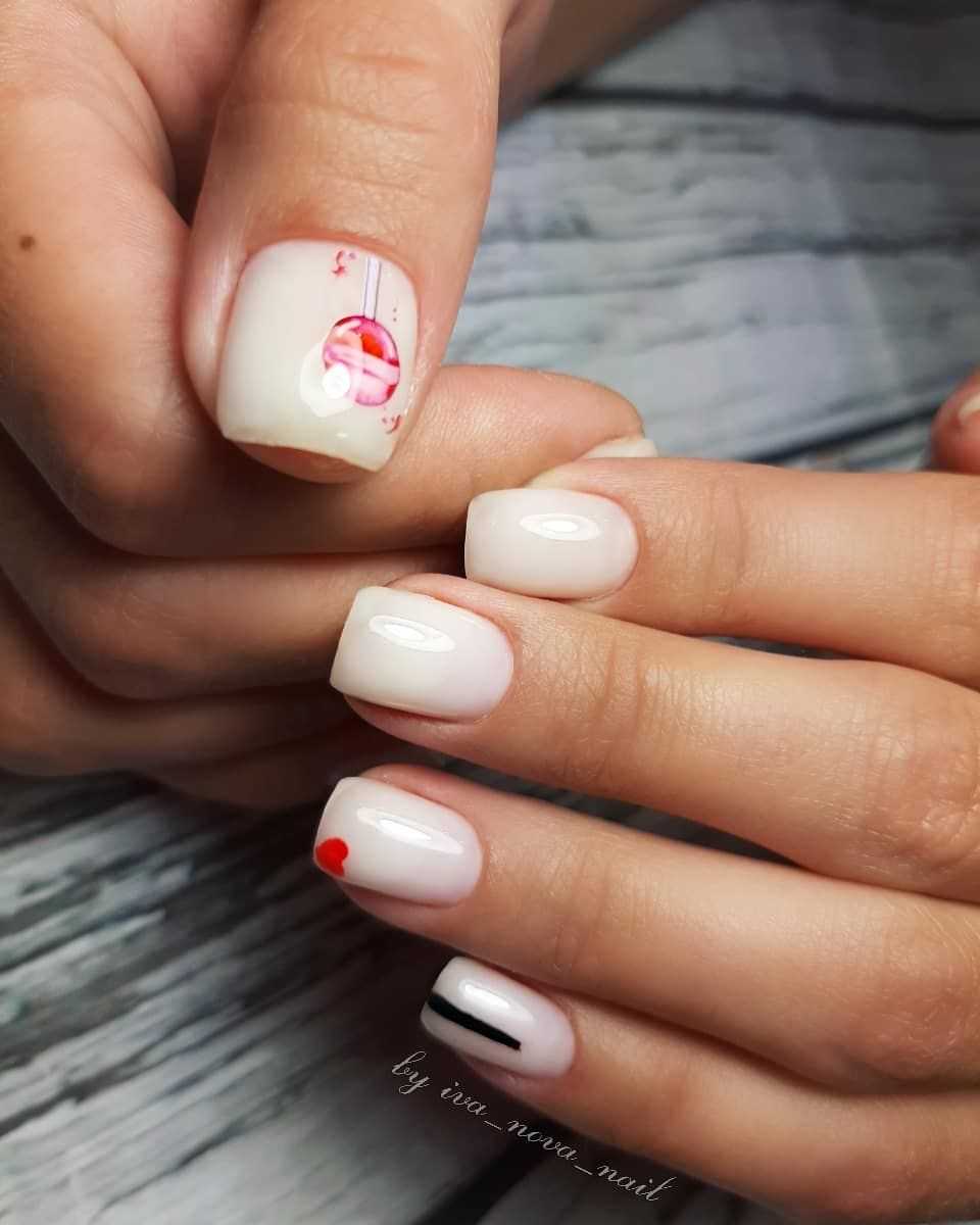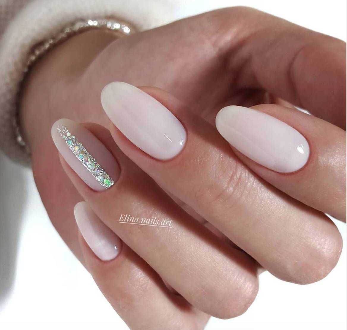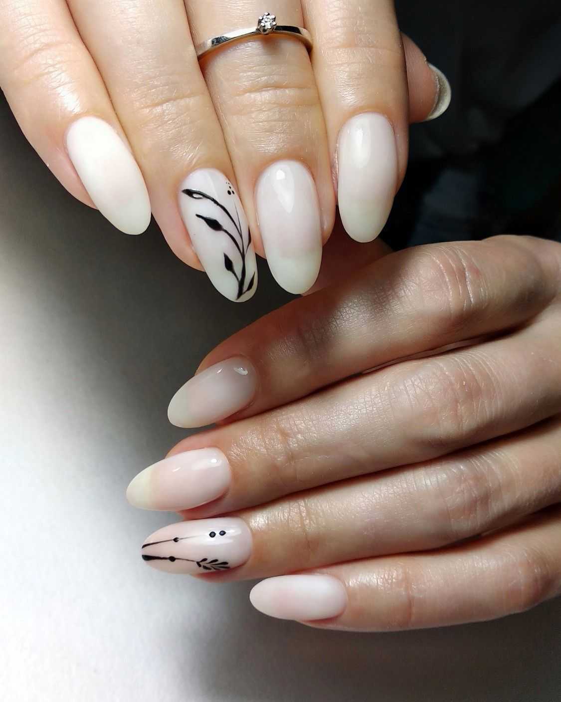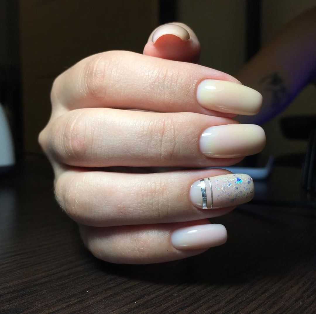 Рядом с нежным молочным не требуется много нюдового, это будет смотреться слишком бледно. Достаточно одного или максимум двух пальцев, а остальные красятся в однотонную классику.