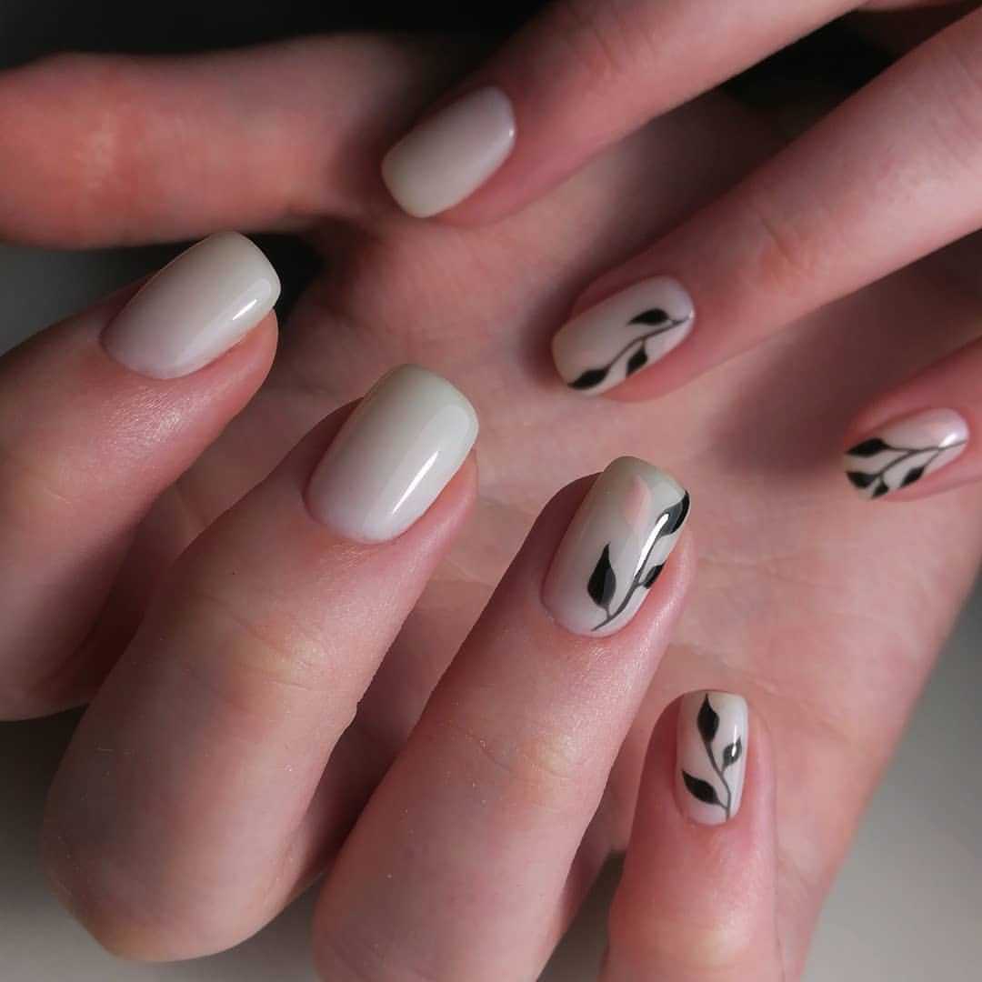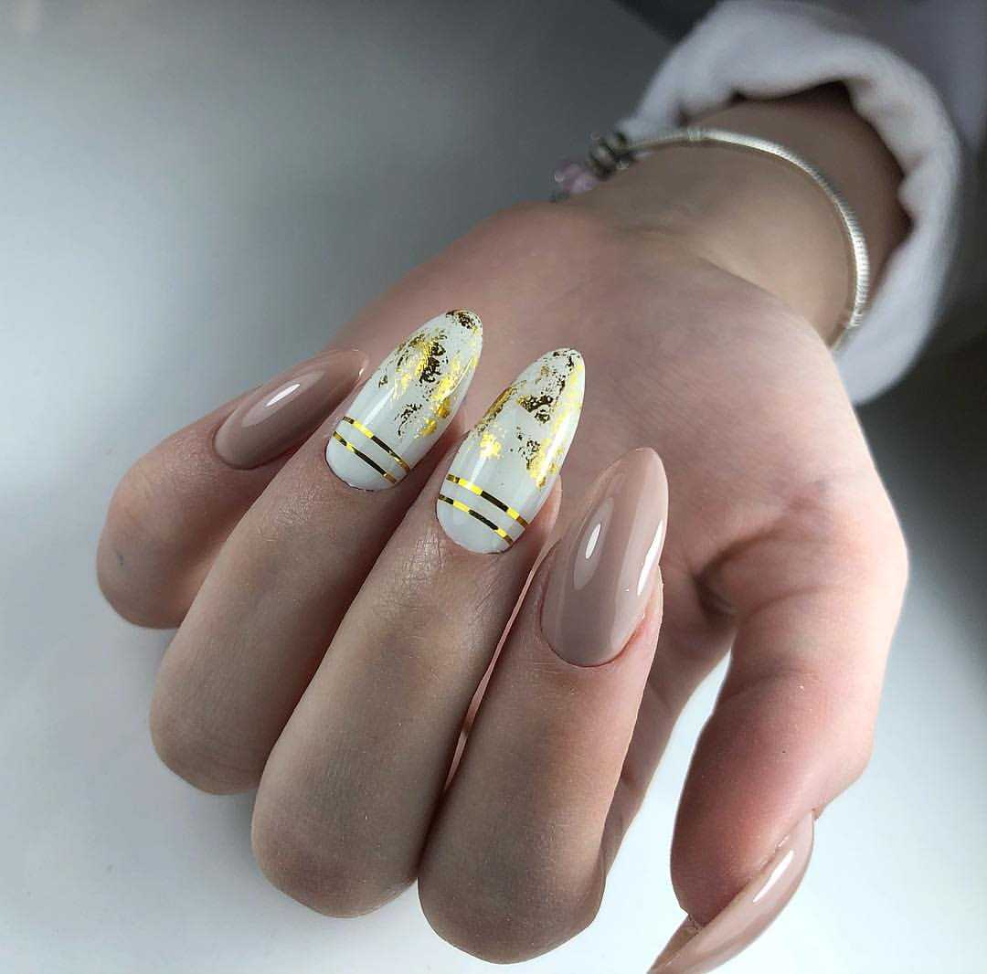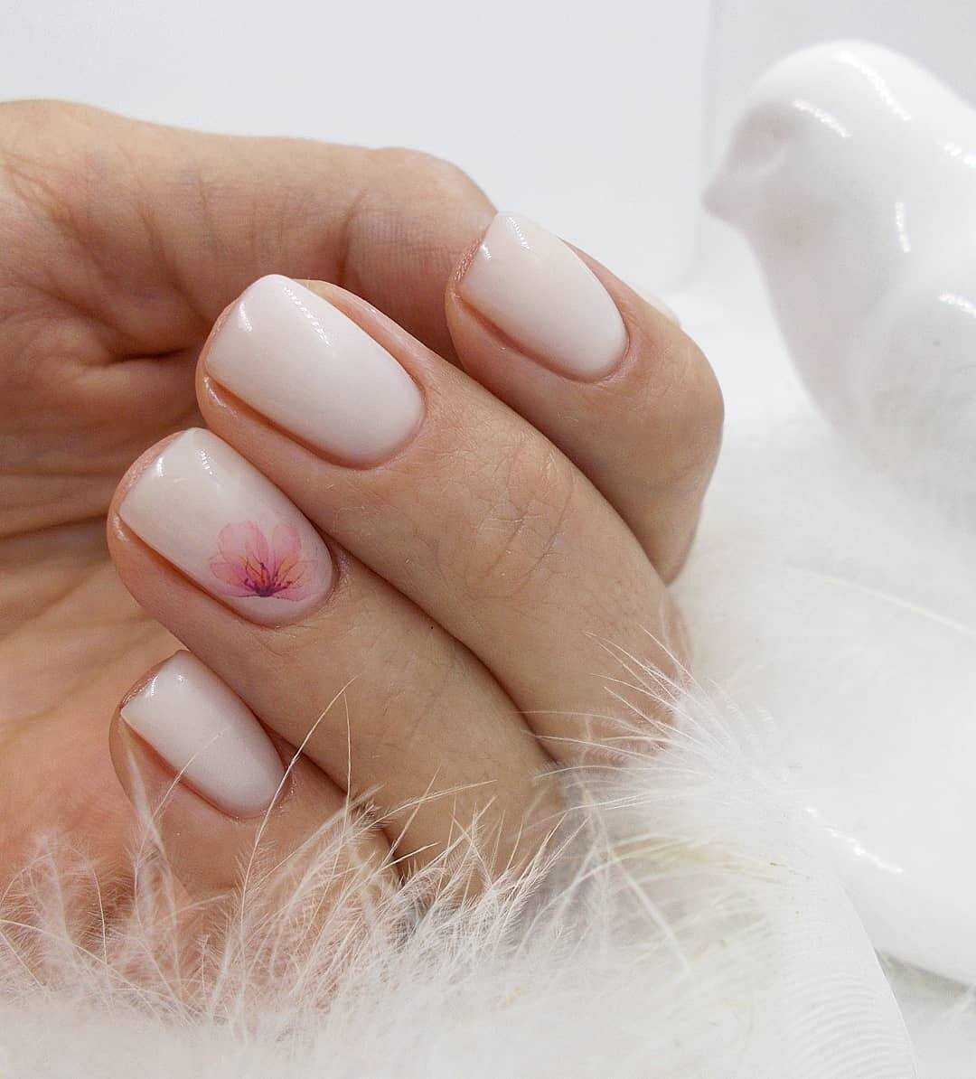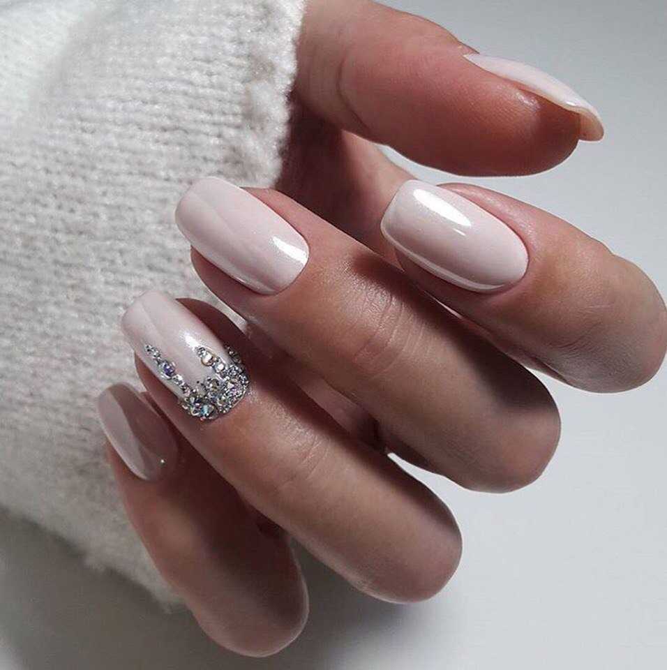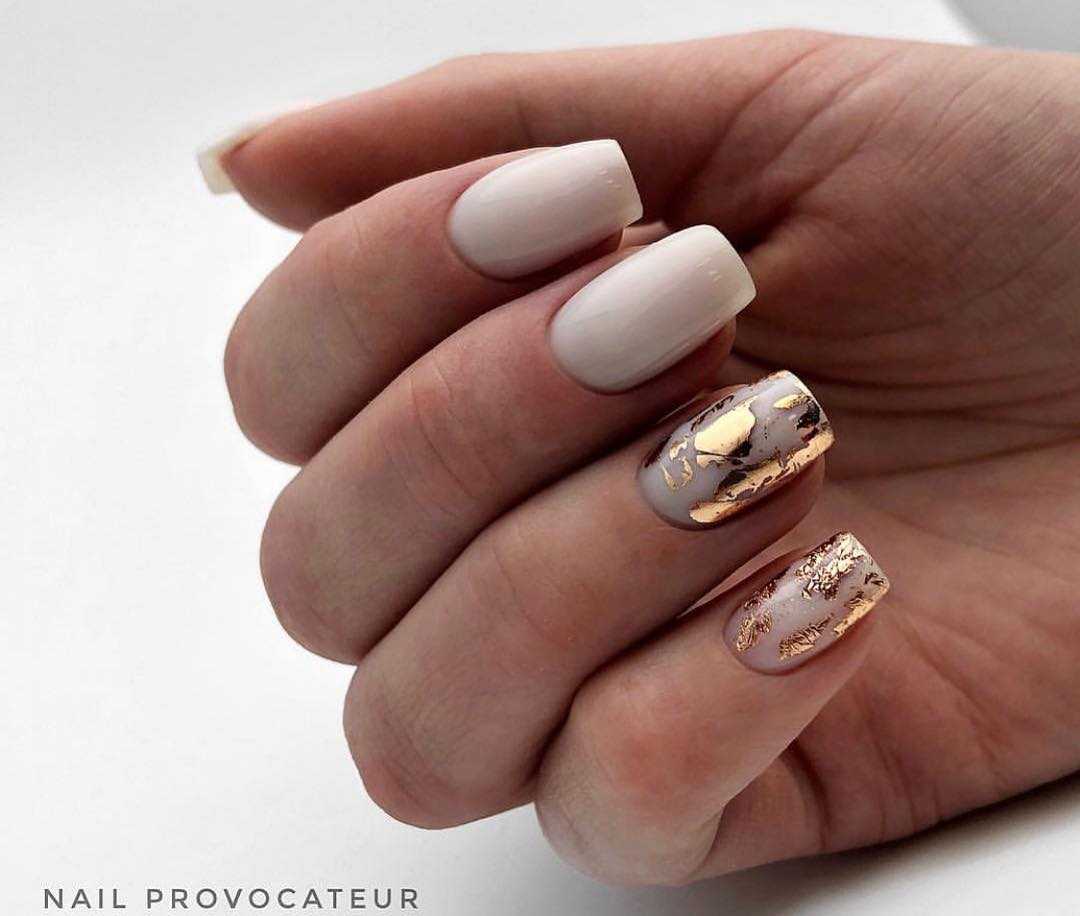 Рядом с нежным молочным не требуется много нюдового, это будет смотреться слишком бледно. Достаточно одного или максимум двух пальцев, а остальные красятся в однотонную классику.