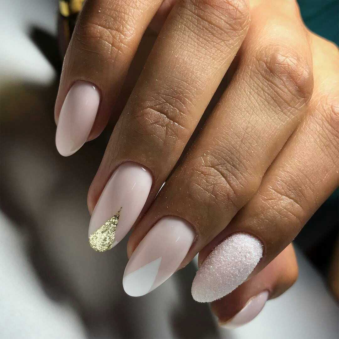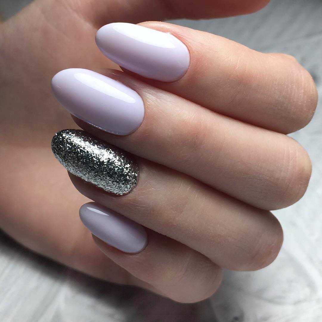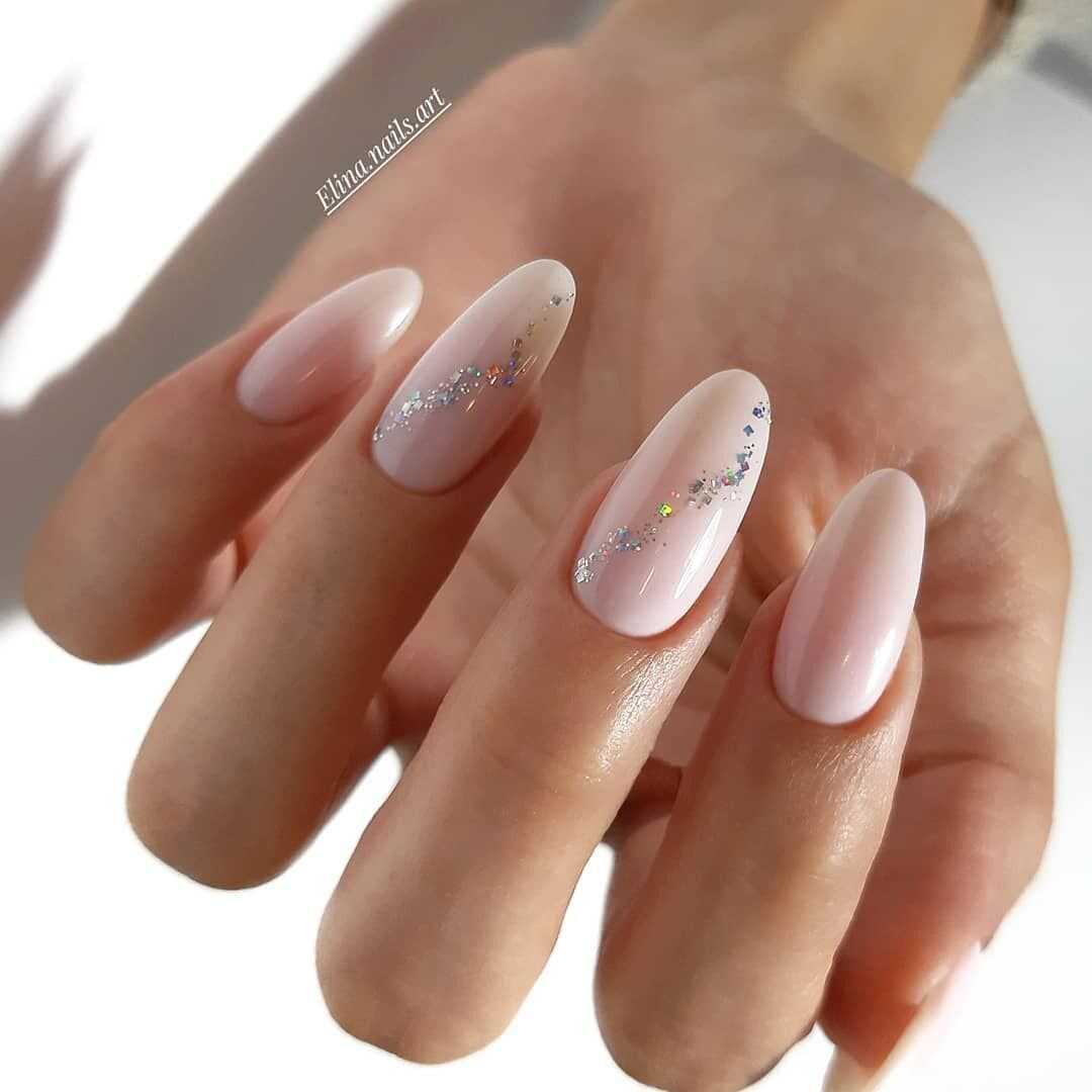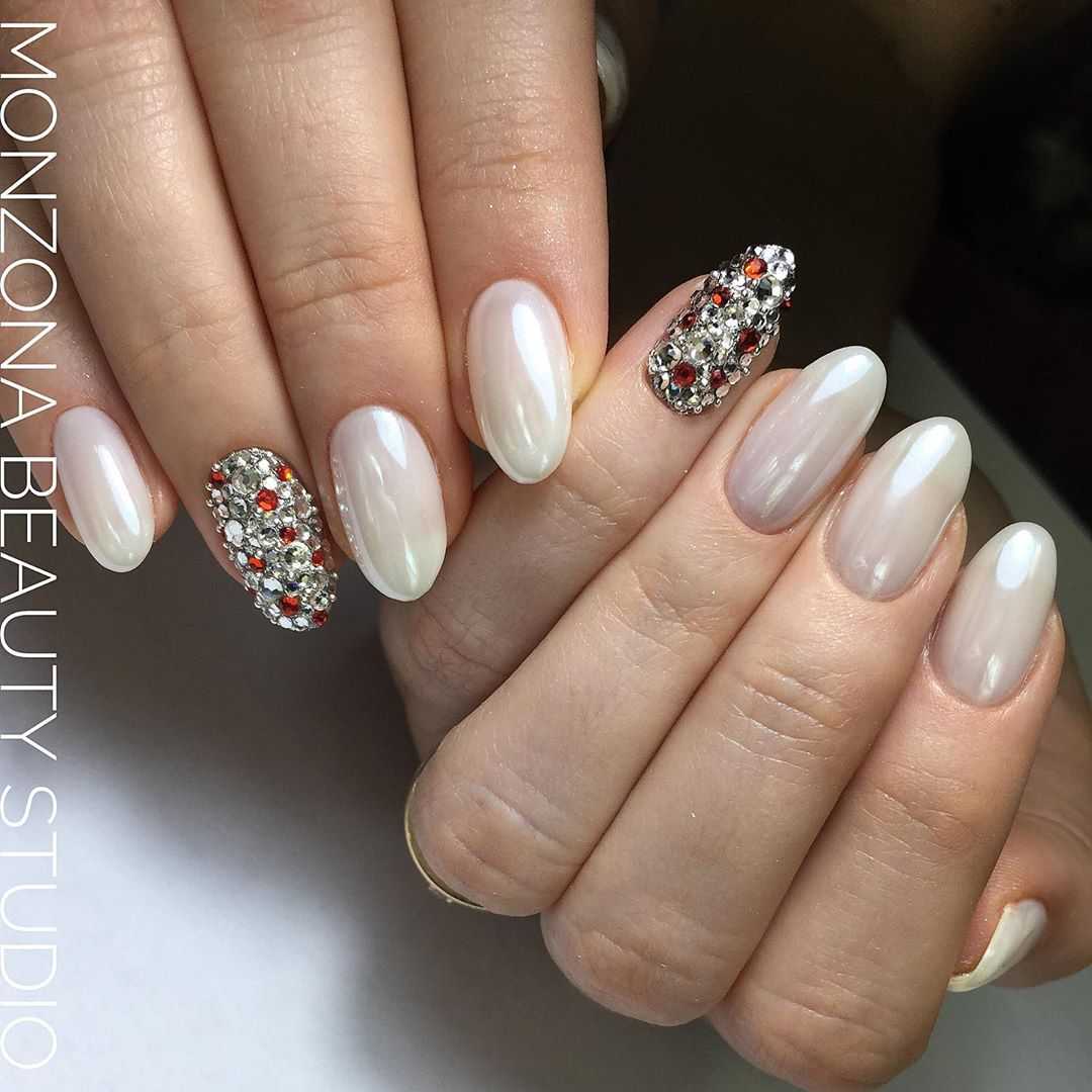 Глянцевую поверхность можно дополнить акриловой пудрой или песком, мелкими блестками или микробисером. Востребованным останется использование жемчужной или перламутровой втирки, которая сделает маникюр на овальные ногти по-настоящему сказочным и волшебным.