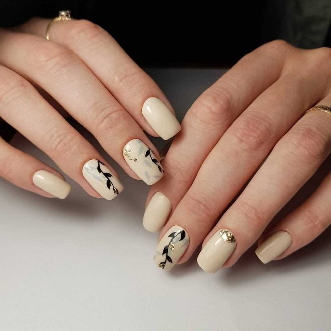 Чтобы придать праздничность дизайну его сочетают с цветом кофе с молоком. Уместны здесь узоры с вензелями или геометрическими формами, золотой шиммер на безымянном пальце.