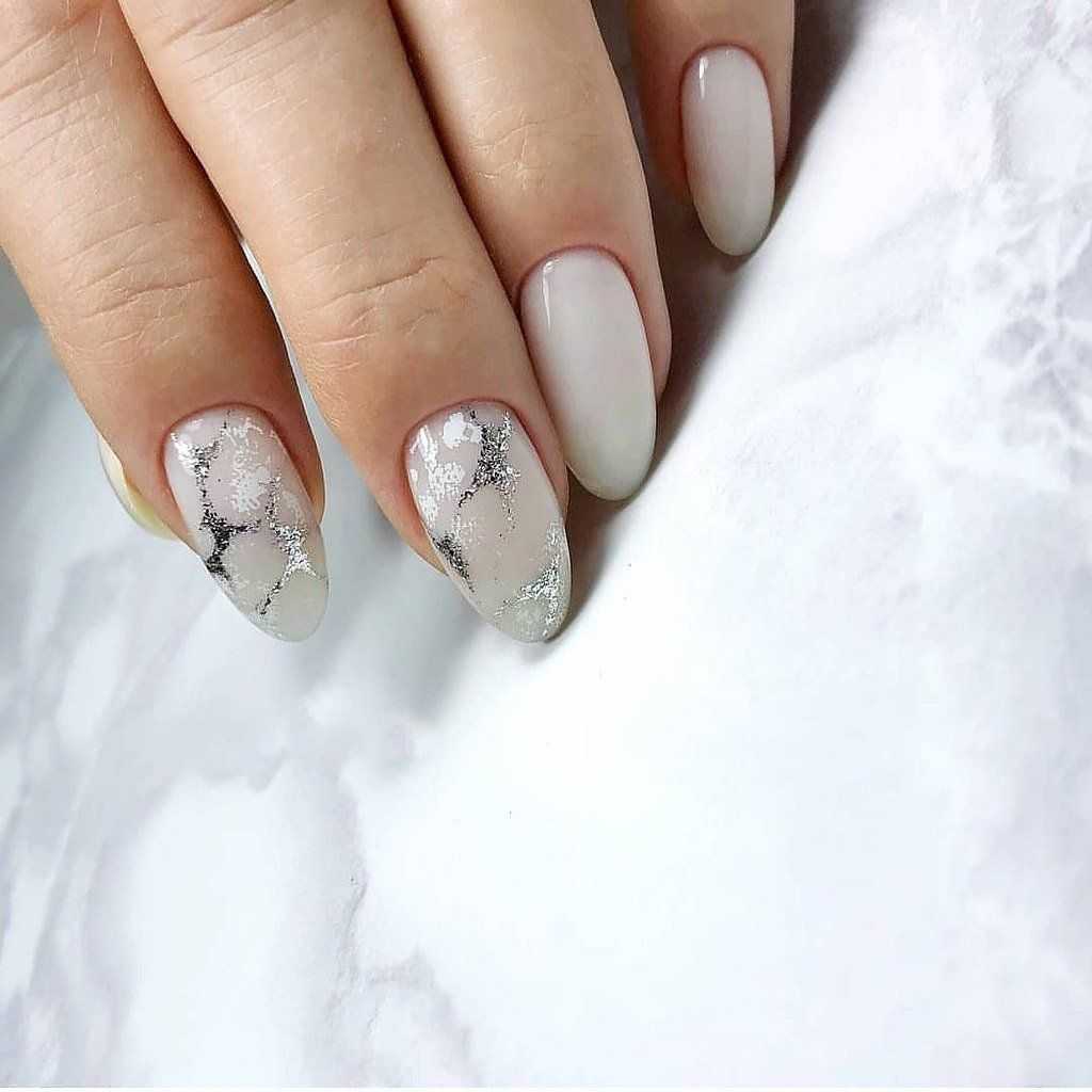 Оттиск фольгой – отличное решение для делового и повседневного маникюра. При этом на молочном фоне можно использовать не только серебряную, но и золотую или радужную фольгу.