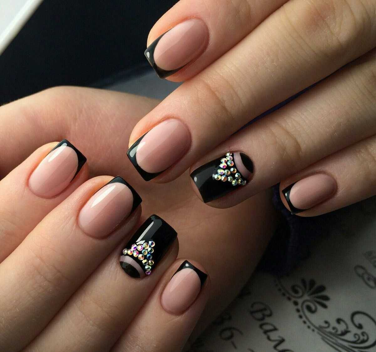 Обратный или перевернутый френч. А вот такую вариацию на коротких ноготках тем более квадратной формы носить опасно – она визуально укорачивает пластину. Но зато точно делает ее уже. Так что обладательницам широких и длинных пластин следует присмотреться к подобной вариации френча, если они выбрали для себя квадратную форму кончиков. В то же время если обыграть перевернутый френч стразами, то можно «сохранить» изначальную длину ноготков.