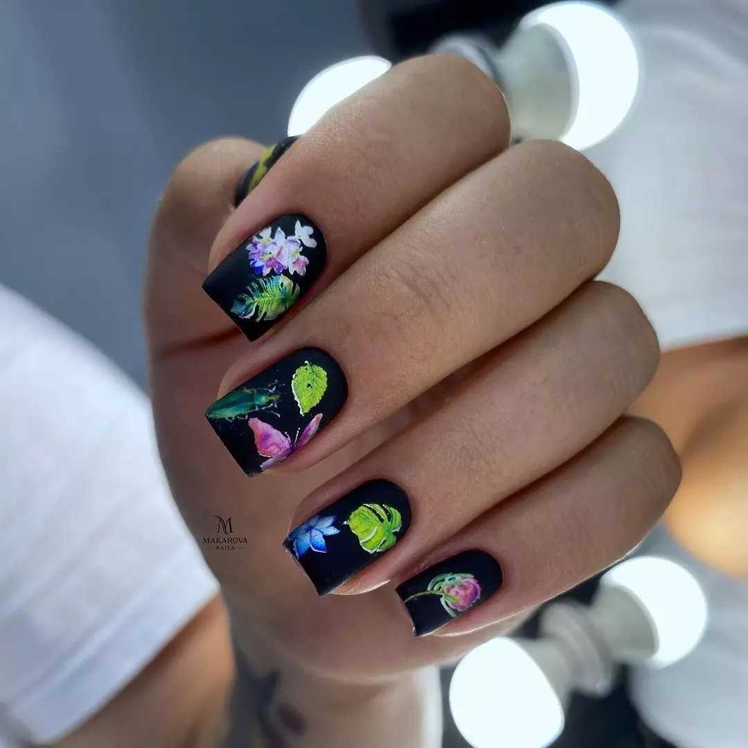 Если вы хотите создать нежный и утонченный дизайн, выбирайте матовый маникюр. Он прекрасно смотрится в любых тонах. Для более впечатляющего дизайна можно добавить мелкие камушки или милые рисунки. Девушки любят наносить на короткие ногти цветочные узоры, веточки, бабочек и листочки.