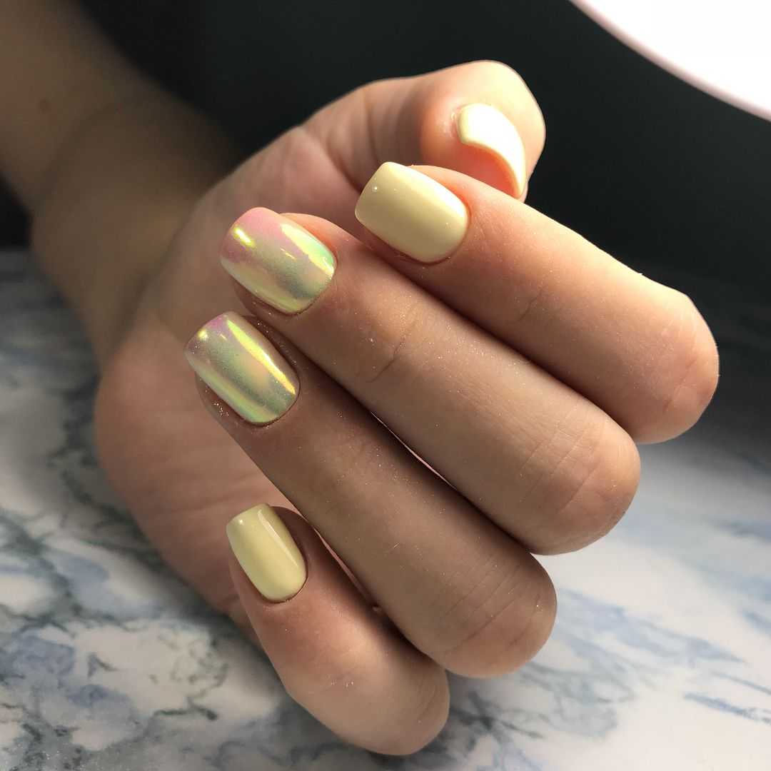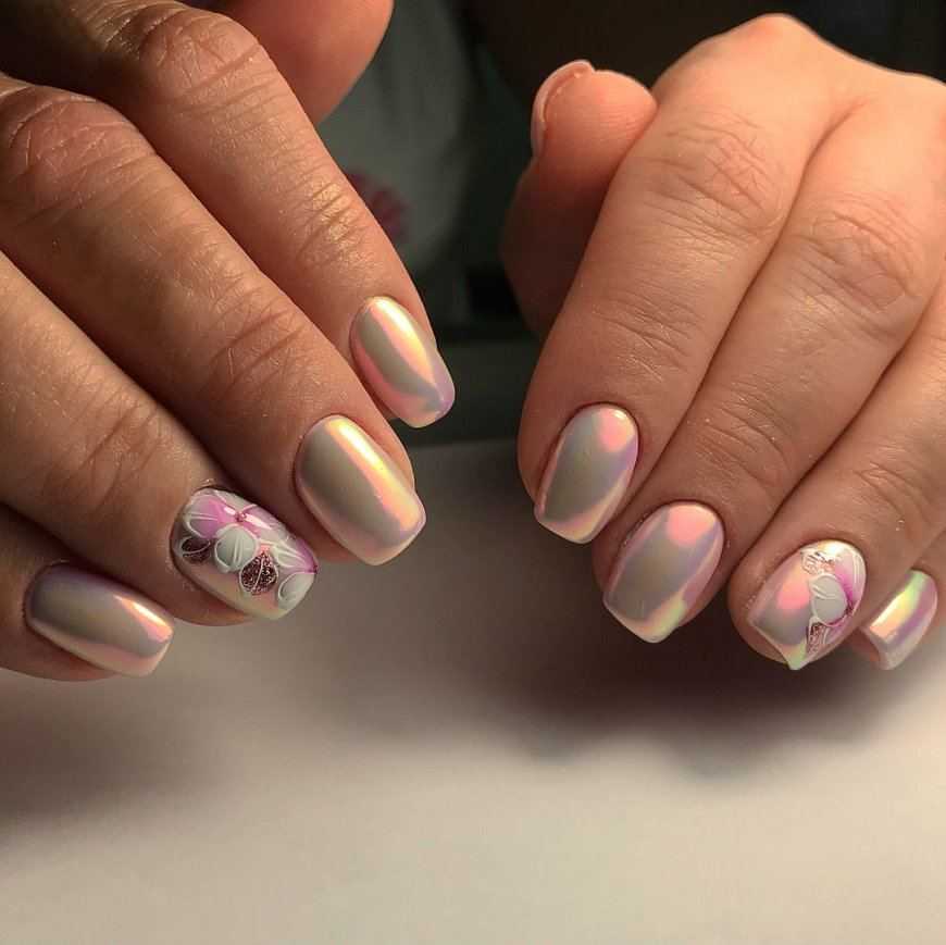 Рассмотрим несколько самых популярных вариантов маникюра с втиркой на короткие ногти. Во-первых, жемчужный пигмент выглядит утонченно, нежно, используется только на светлой основе. Во-вторых, голографическая втирка создает красочные переливы. В-третьих, если хотите добиться металлического блеска, используйте зеркальную втирку. В-четвёртых, изумрудно-золотые переливы – результат нанесения втирки «жук».