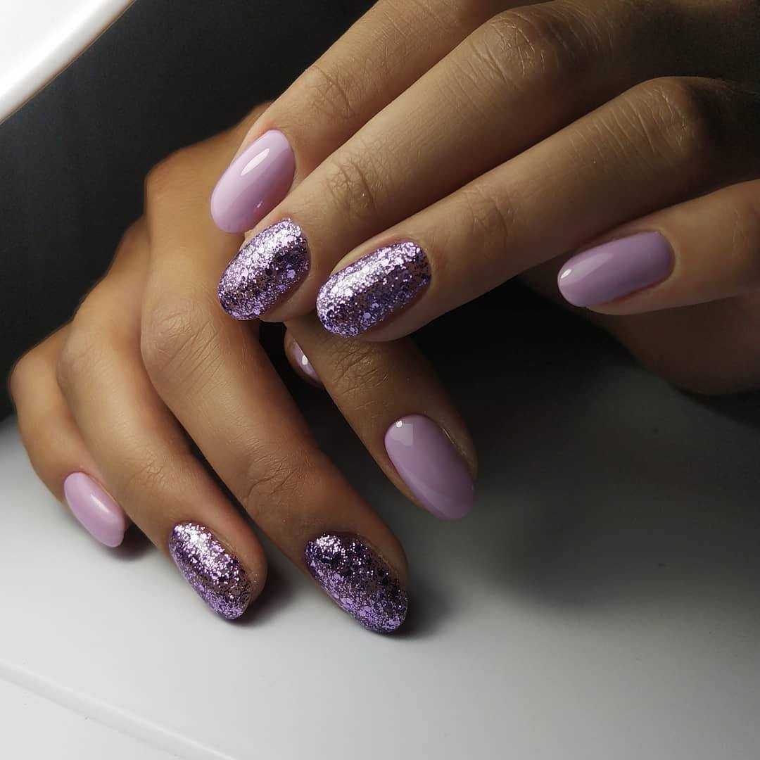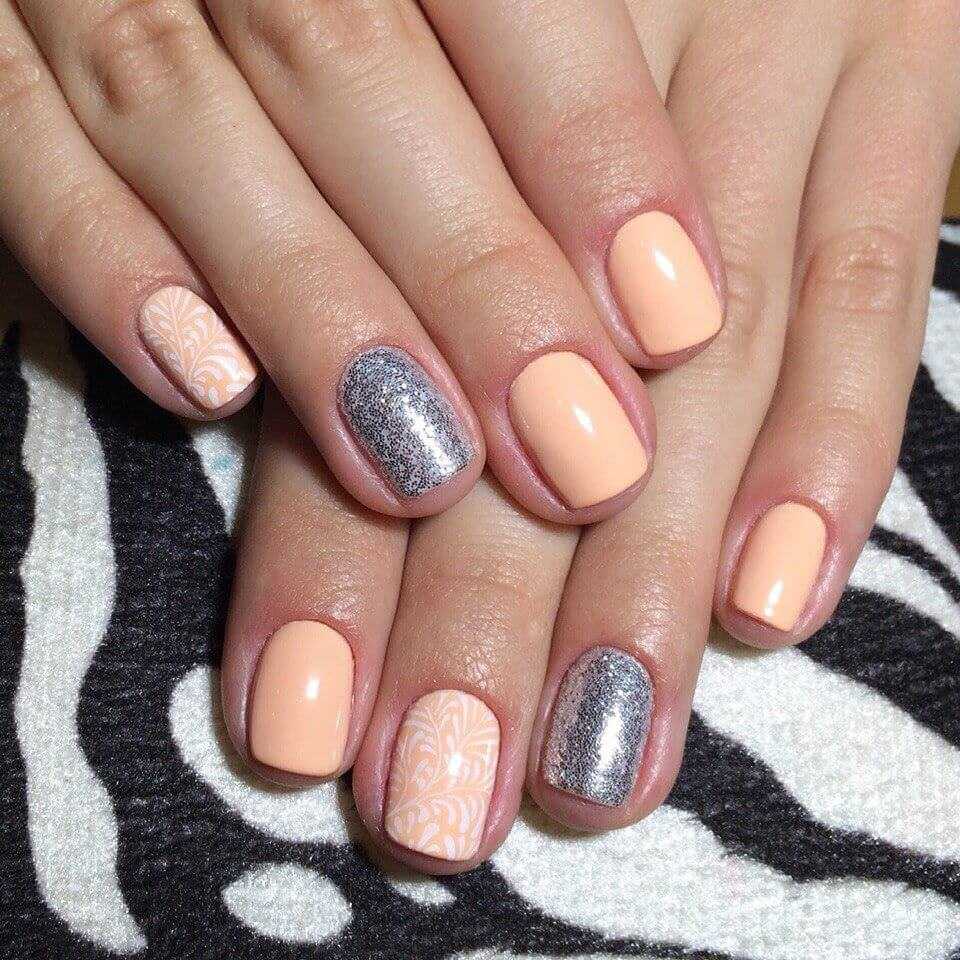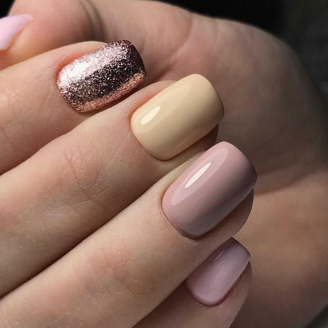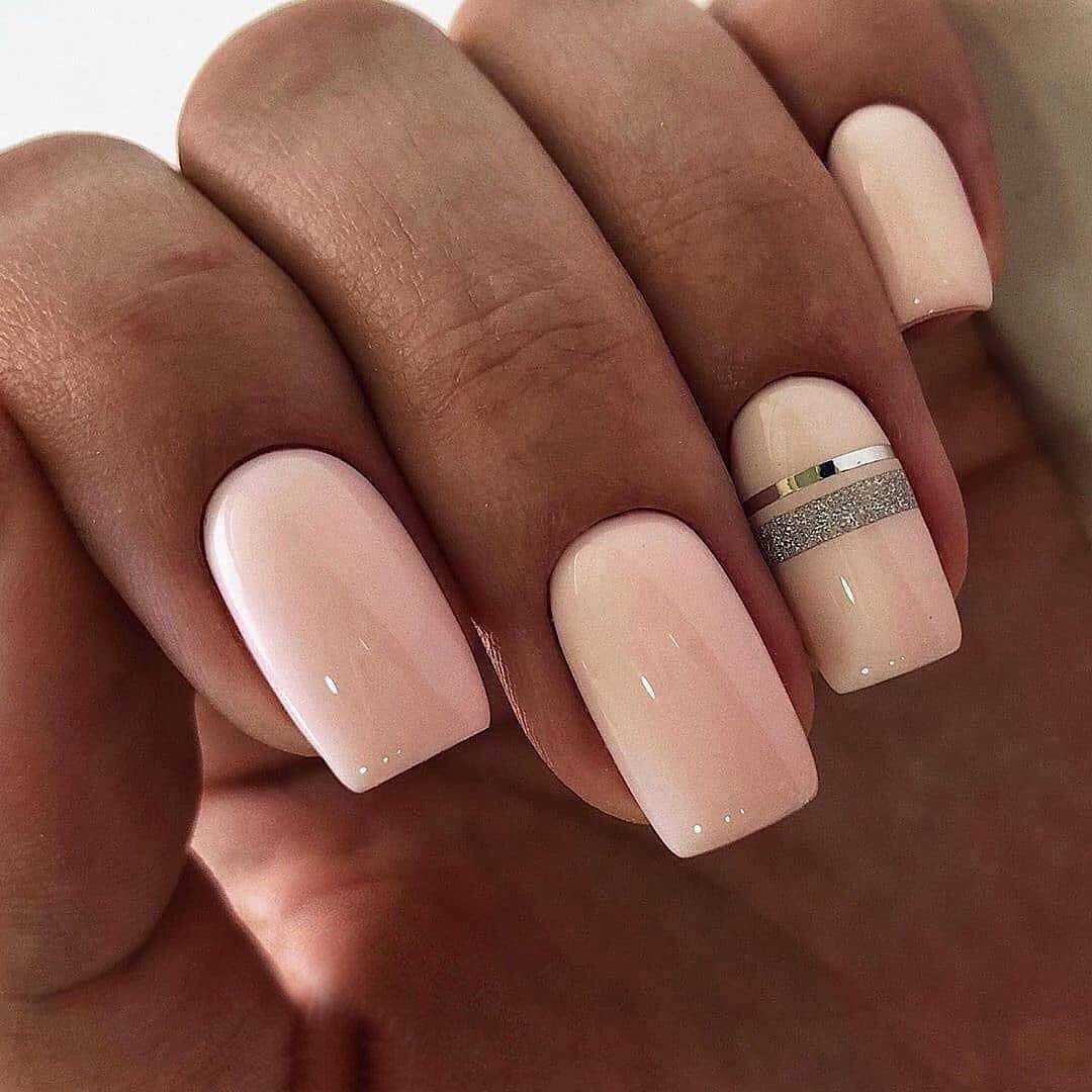 Хорошо использовать с нюдом и глиттер, но при этом важно выбирать нежные и сдержанные оттенки. Вы можете также как и с белым нюдом накрасить всего лишь один ноготь, а можно добавить немного глиттера сверху нюда