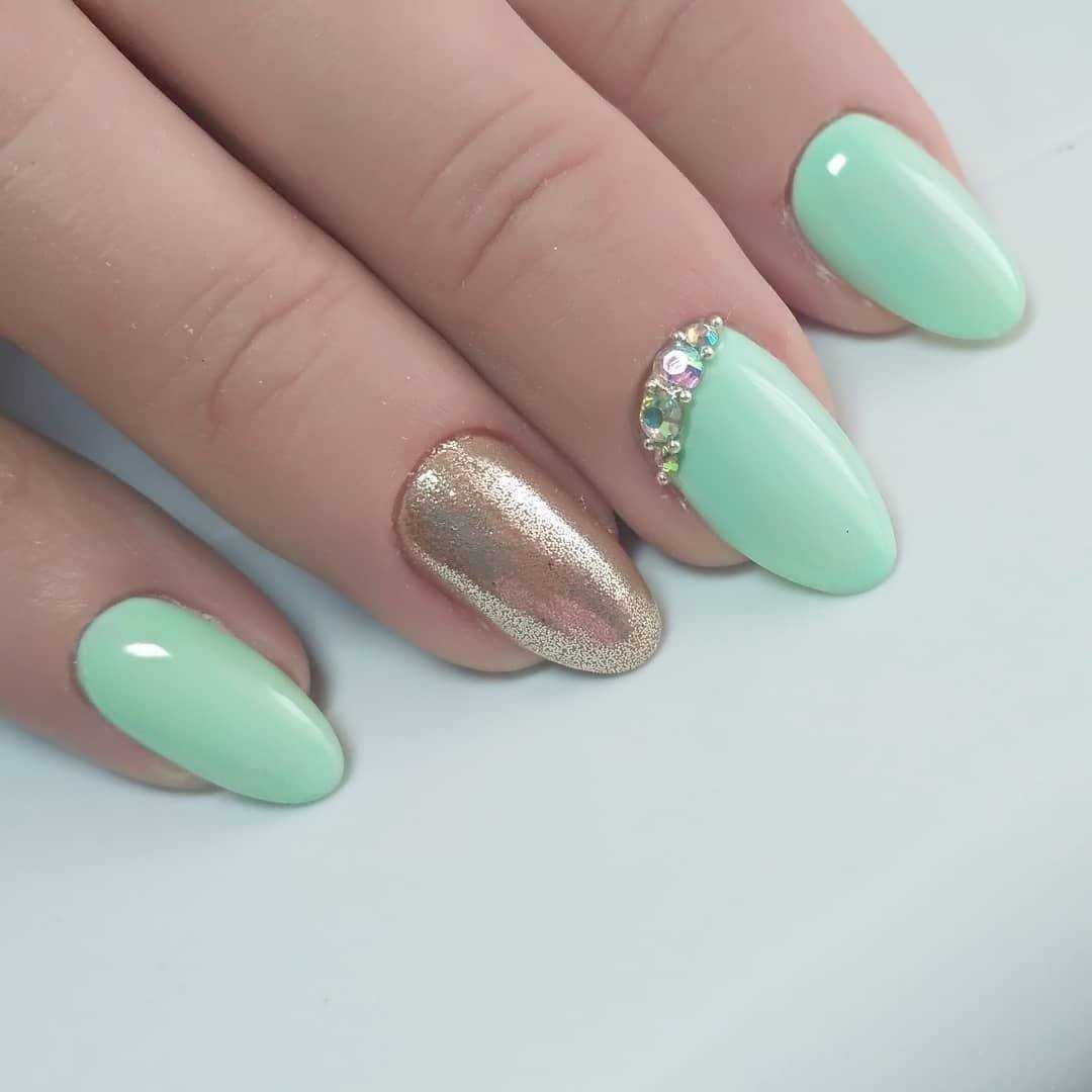 - Мятный с золотом – матовая основа в соединении с блестящими элементами выглядит очень презентабельно.