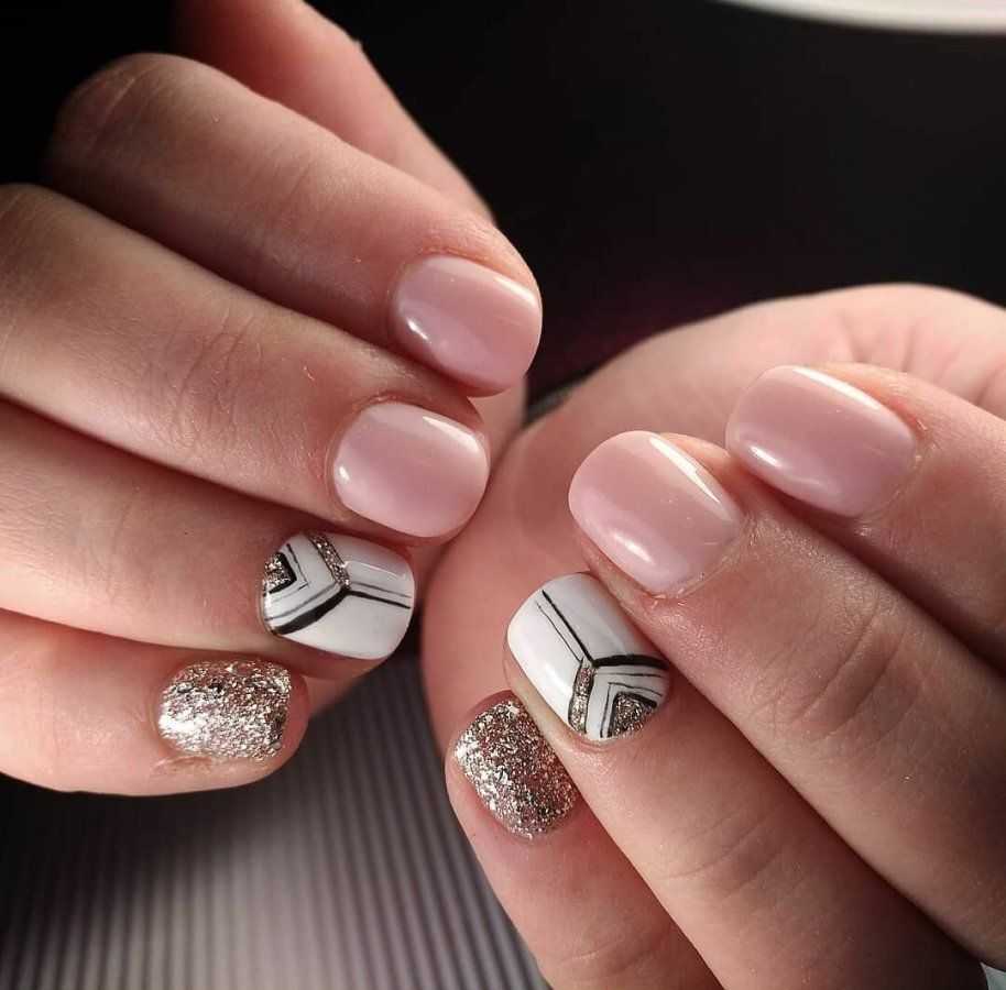 - Треугольная геометрия – на каждой руке выбирается один палец, на который наносится многоярусный треугольник из белого, розового, бежевого тонов.