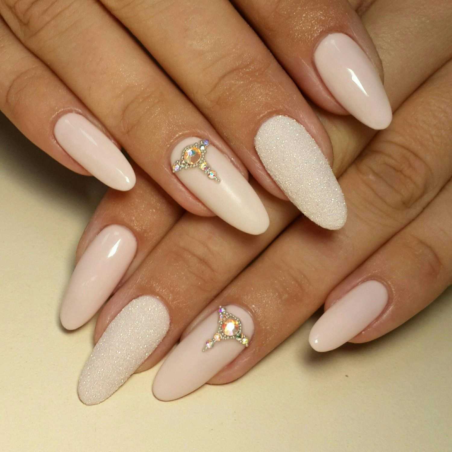 - Нюд с камнями – базовая работа декорируется стразами по центру, удлиняя пальцы и добавляя шика.