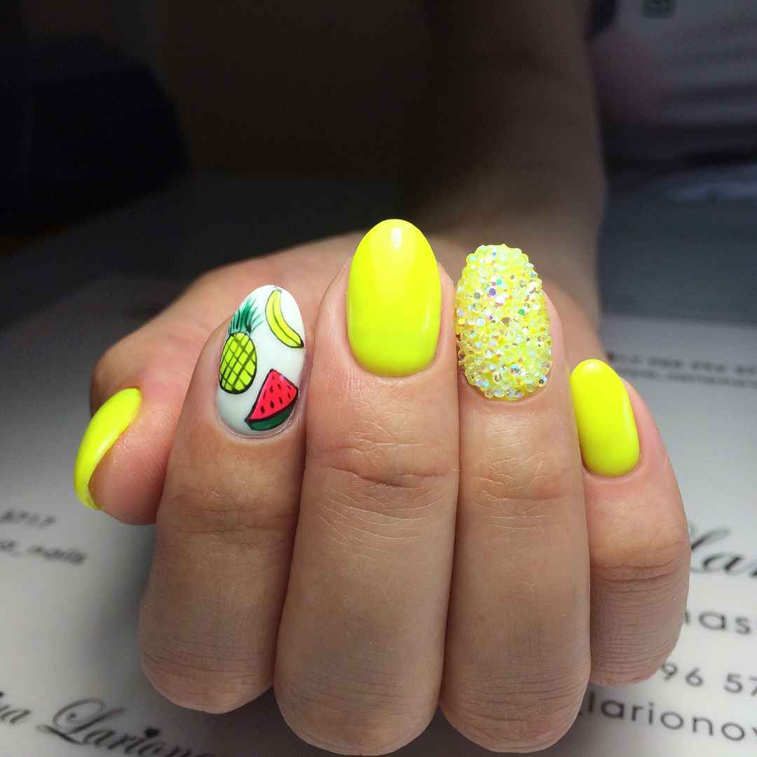 Подчеркнет «изюминку» во внешности маникюр с изображением фруктов. Актуальным решением для летнего отдыха, тематической встречи, для праздничного настроения в холодную пору станет маникюр с игривым ананасом.