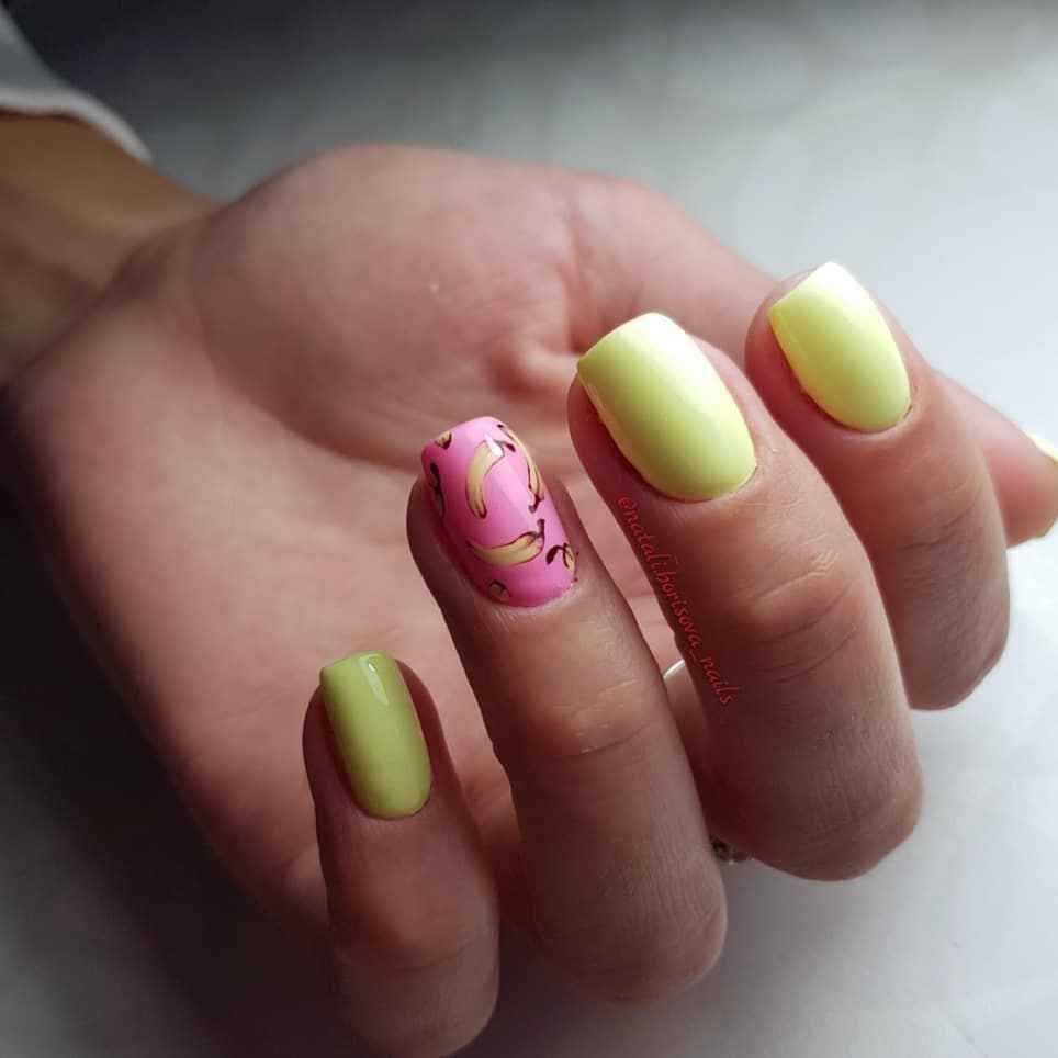 Чтобы образ получился более элегантным и спокойным, выберите для основы пастельные оттенки, например, розовый или бежевый. Или нарисовать бананы можно только на одном ногте, а другие сделать однотонными.