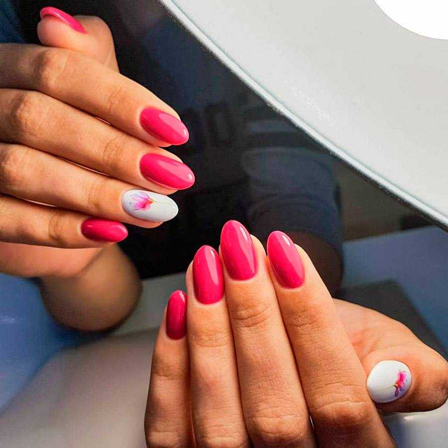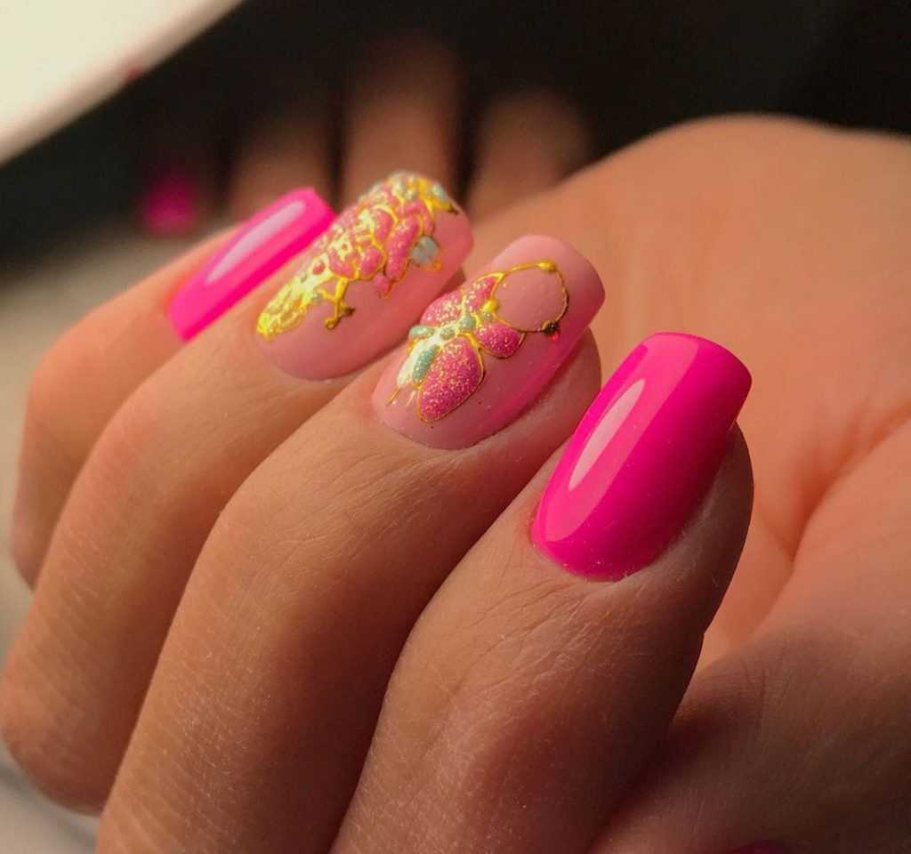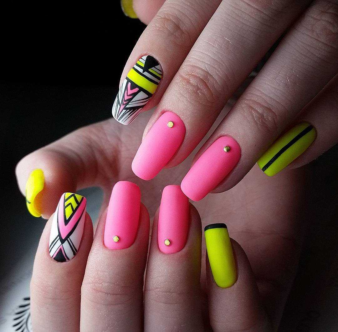 Шикарно смотрится желтый неоновый оттенок в сочетании с розовым цветом. Используйте технику “разные ручки”. Желательно не дополнять маникюр другими оттенками или декором. Неоновые тона и без того смотрятся достаточно ярко, поэтому дизайн лишь усложнит нейл-арт.