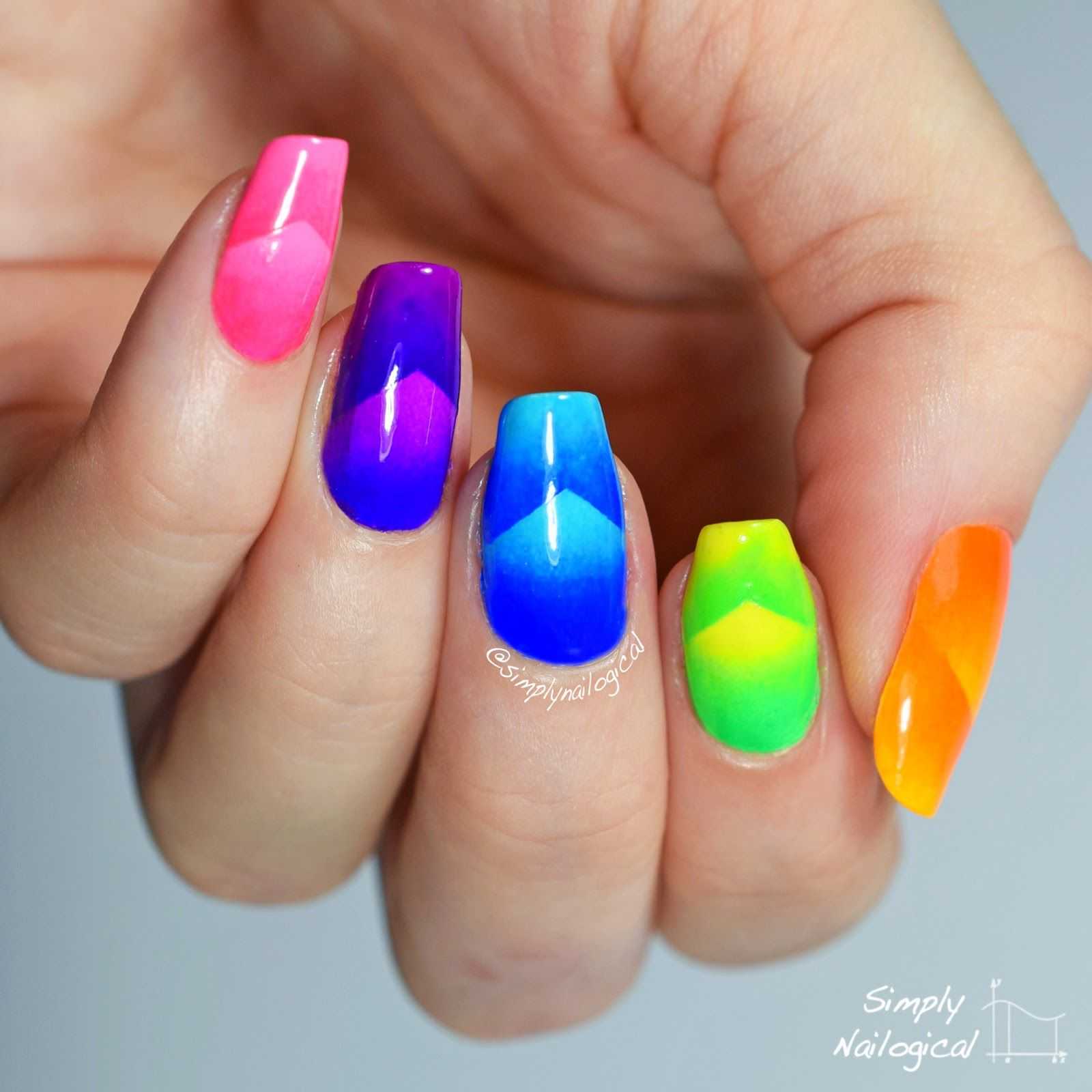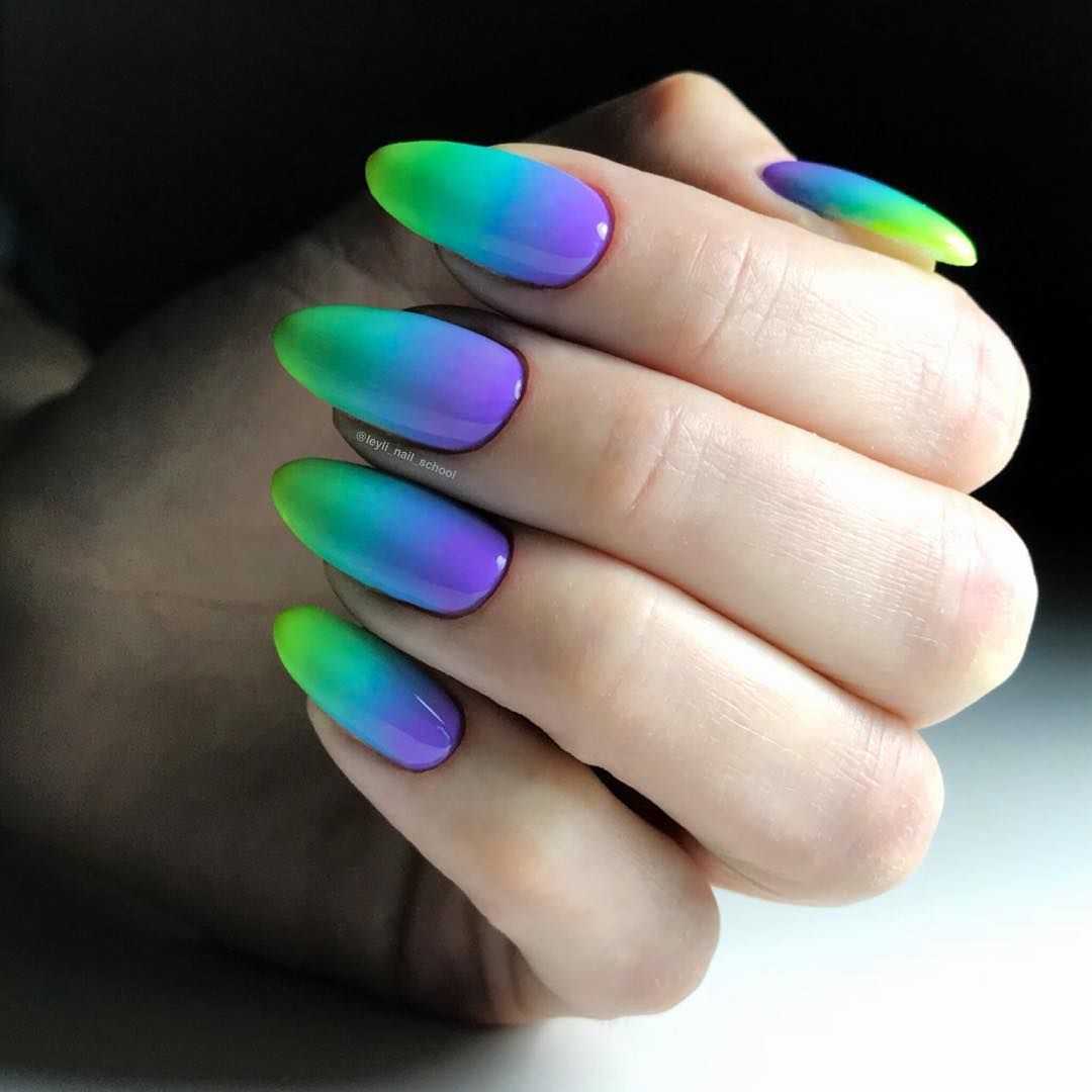 С помощью градиентного маникюра получится показать красоту сразу нескольких оттенков. Используйте все разнообразие неоновых тонов в одном нейл-арте. Яркие оттенки хорошо растушевываются и гармонируют друг с другом.