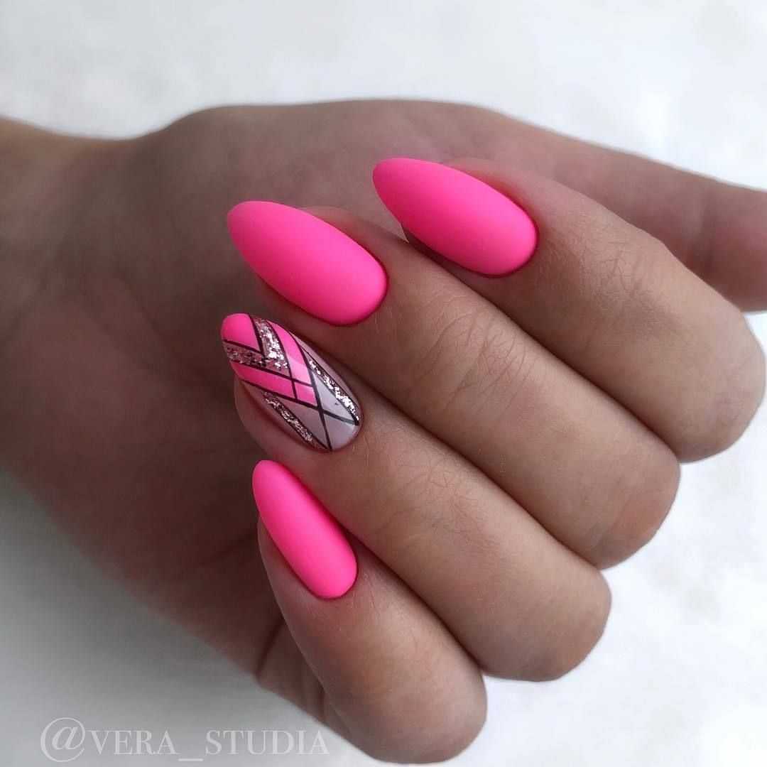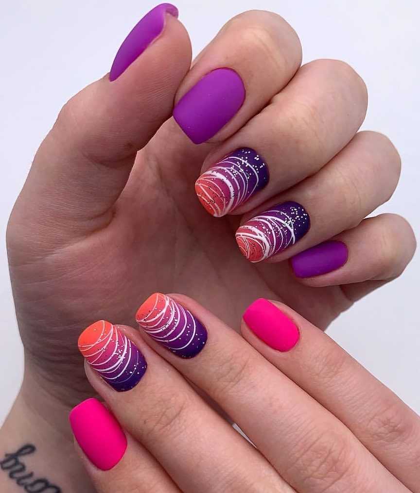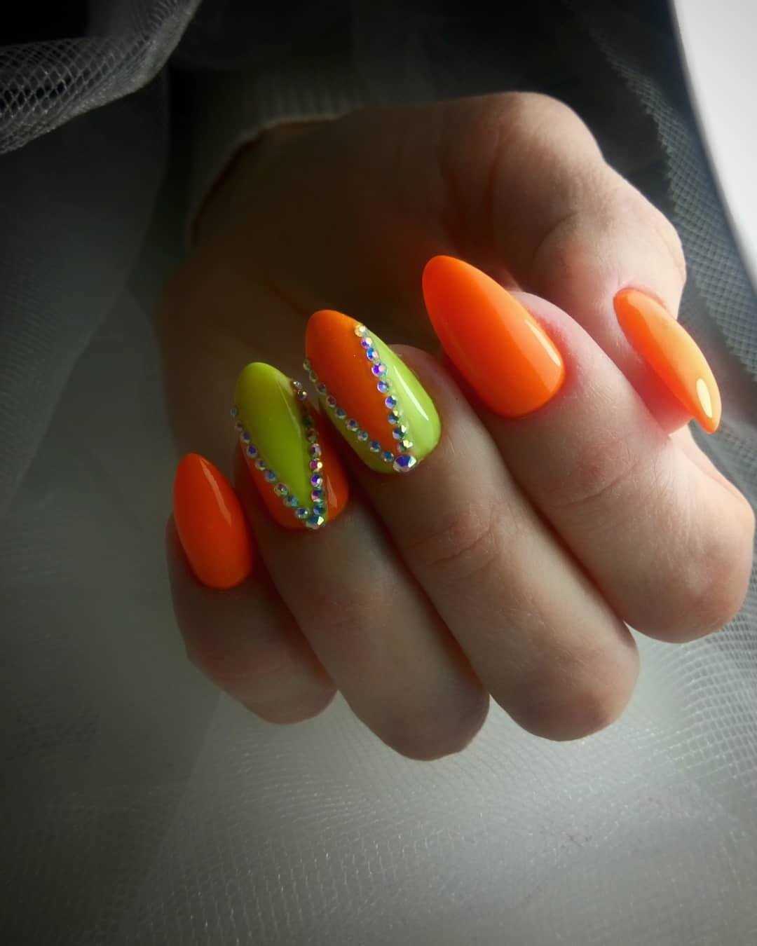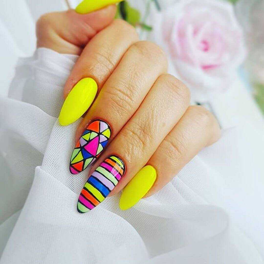 Яркими оттенками делают полосы, фигуры, дополняя элементами декора: стразами, лентами, пайетками. Линии разной толщины и длины смотрятся презентабельно на неоновом маникюре.