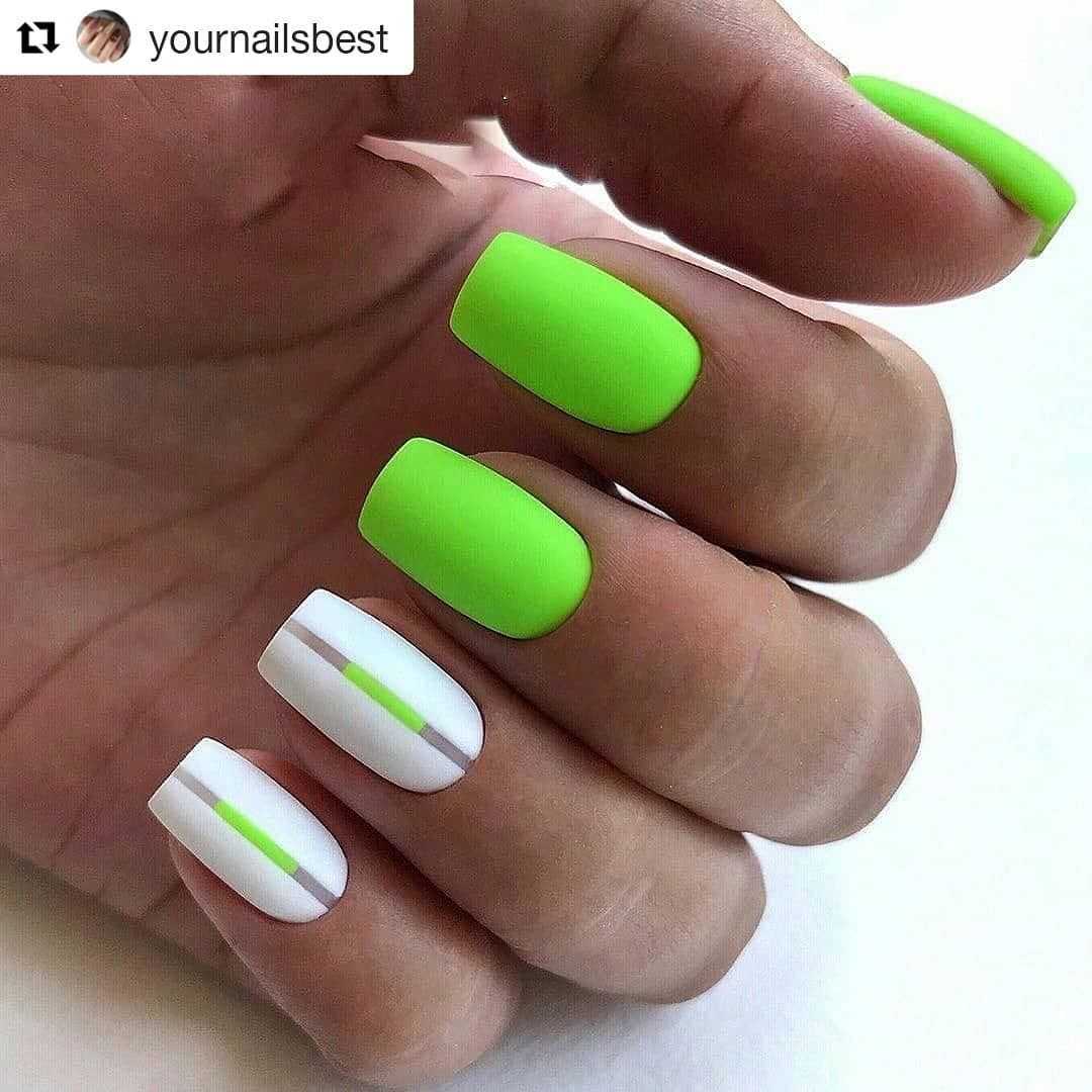 Матовый финиш немного приглушает неон на ногтях, но такой дизайн выглядит еще красивее. Можно сделать это на всей поверхности или покрыть только половинку пластины, а вторую оставить глянцевой.