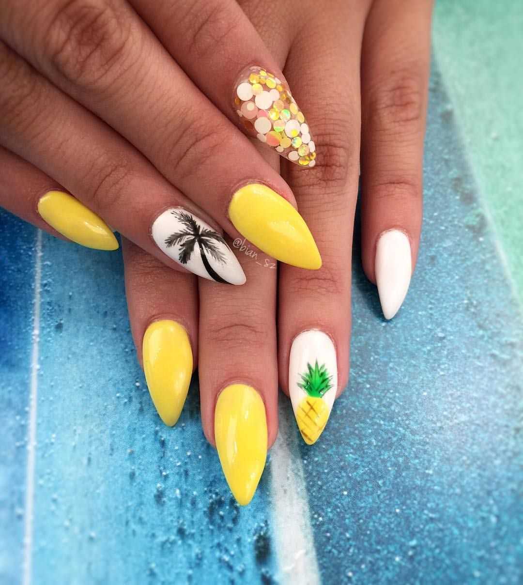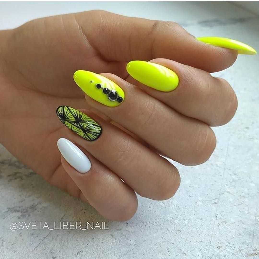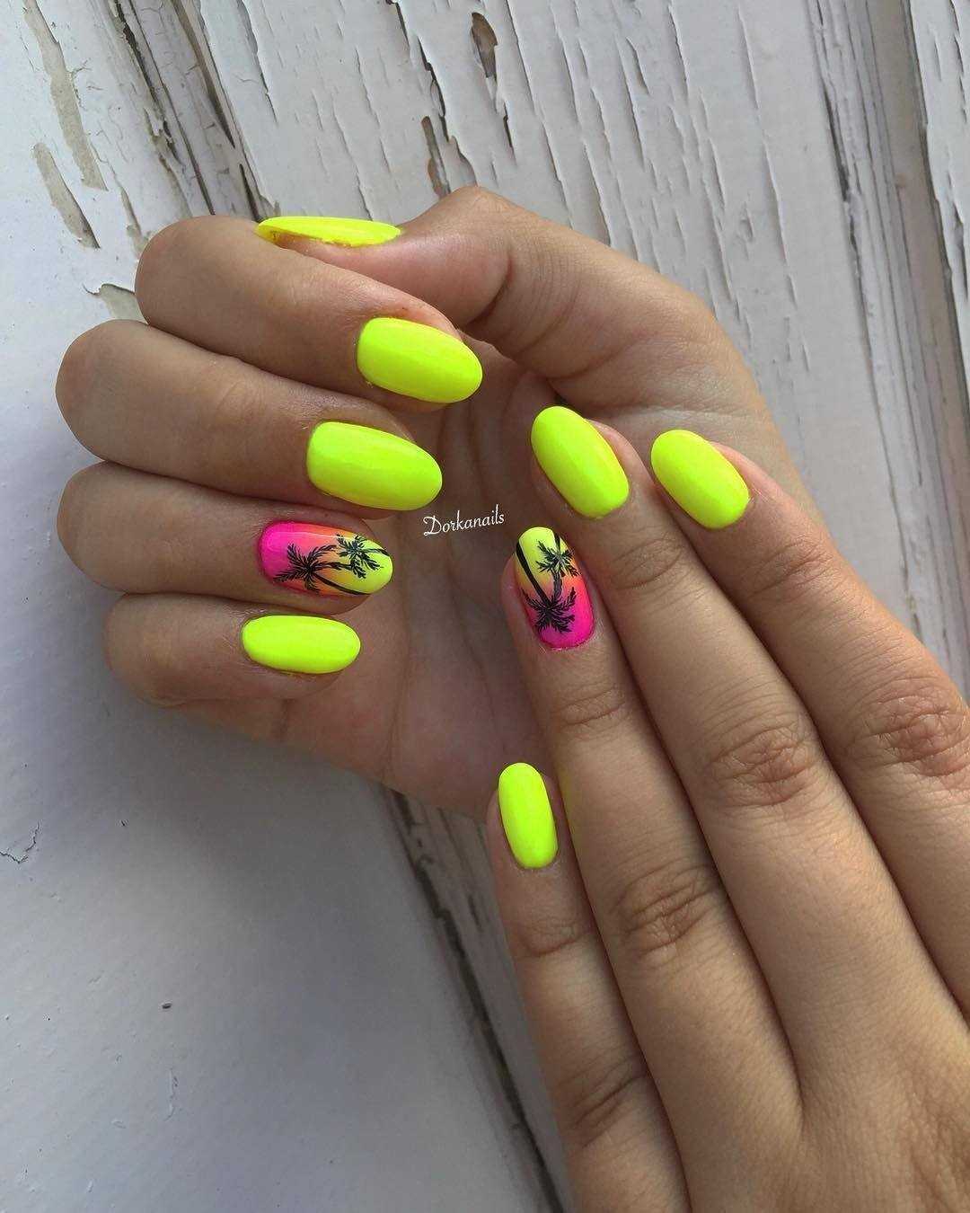 Неоновый желтый маникюр хорош для отпуска на море. Здесь он будет чувствовать себя вполне уместно и естественно. Если вы хотите, чтобы дизайн смотрелся сдержаннее, то используйте в качестве дополнения белый гель-лак. Что касается техник маникюра, то популярностью пользуется однотонное поочередное окрашивание ногтей желтым и белым, градиентный маникюр, дизайн с акцентными тематическими узорами.