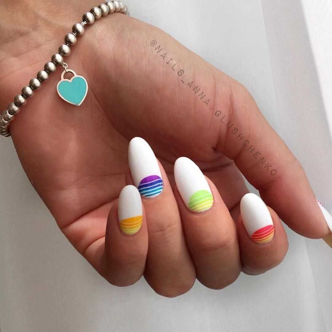 - Разноцветные ногти. Покрасить ногти во все цвета радуги следует хотя бы один раз в жизни. Просто чтобы испытать, как это — носить на ладонях целую маленькую палитру и рассыпать вокруг себя в темноте яркие цветные огоньки.