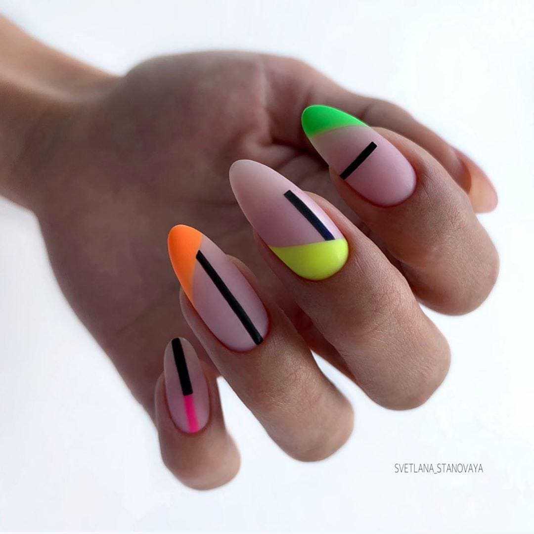 Неоновые лаки предоставляют огромный простор для экспериментов. Можно оттолкнуться от идей самого популярного дизайна с их применением: