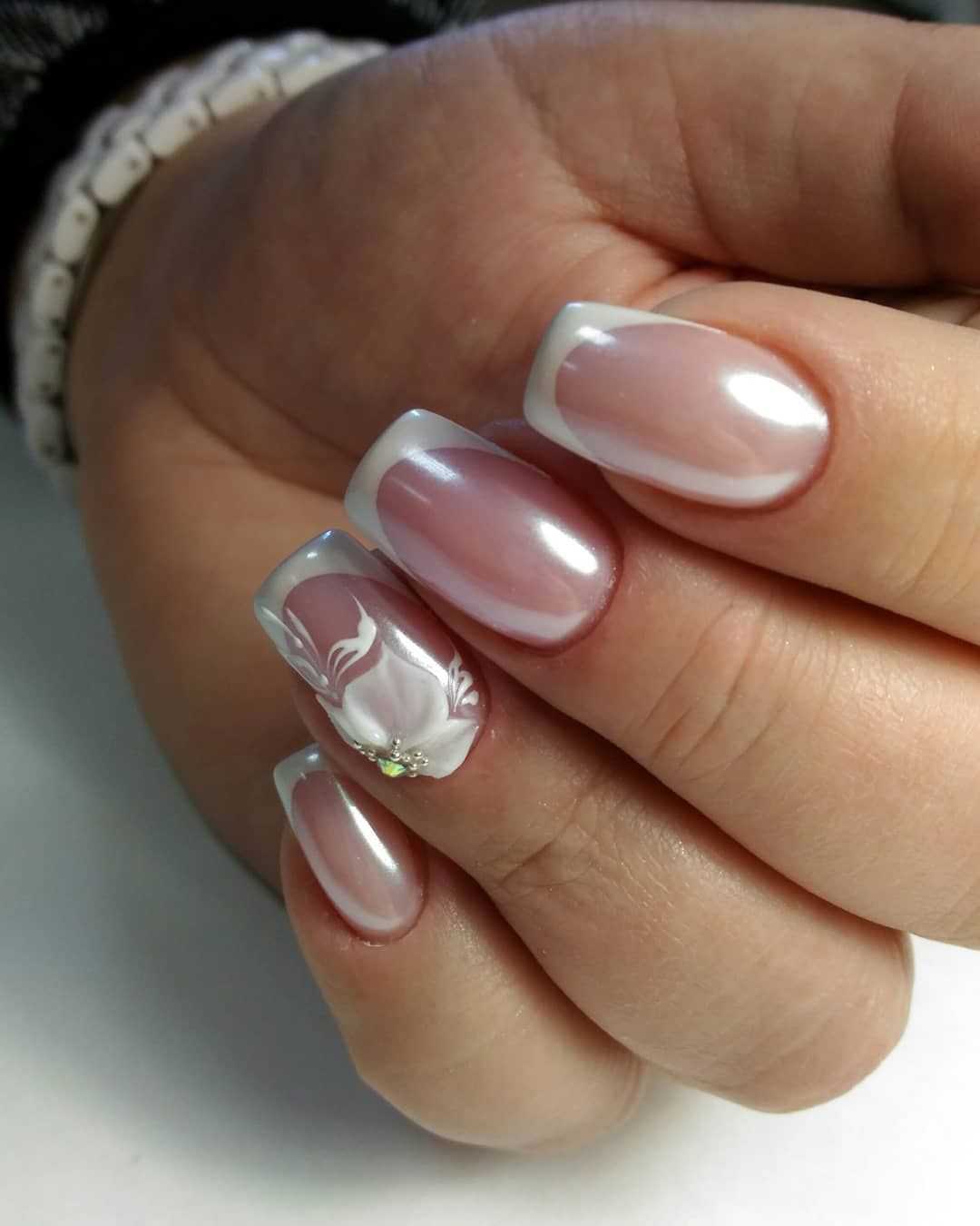 Стоит сказать пару слов о необычайной нежности и трогательности французского маникюра. Ведь совсем не зря мастера часто берут его за основу свадебного дизайна ногтей. Благодаря элегантности и изяществу данного стиля, мастер маникюра создает трогательный и утонченный, девственно-чистый и нежный образ невесты.