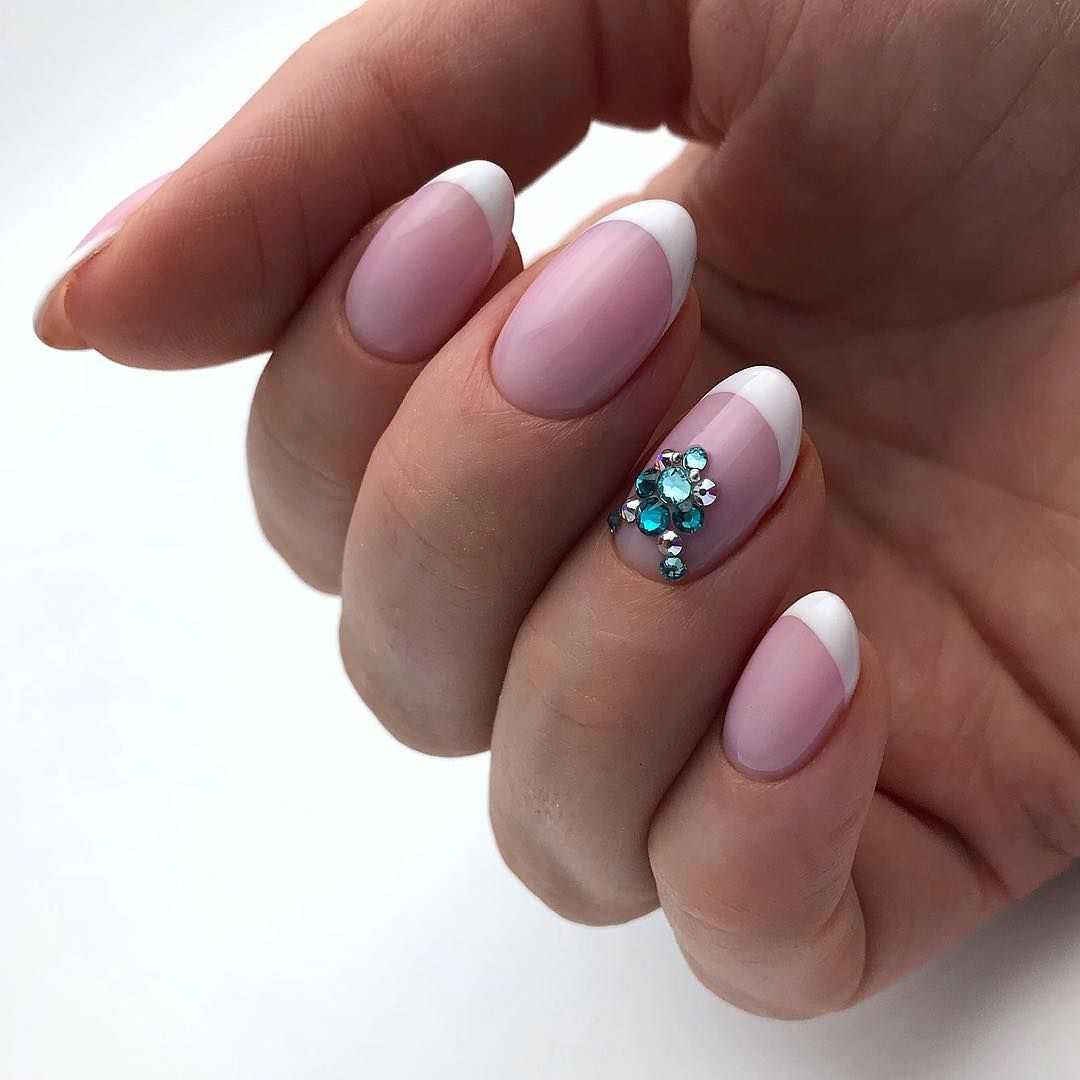 Еще один способ преобразить классический френч – дополнить его оригинальным декором. Различные камушки и стразы давно стали самым популярным вариантом. Несколько штук на одном или двух ноготках подчеркнут элегантность маникюра. В свою очередь, россыпь страз сделают дизайн более праздничным. Поэтому при выборе декора всегда учитывайте, планируете ли вы посещать мероприятия.