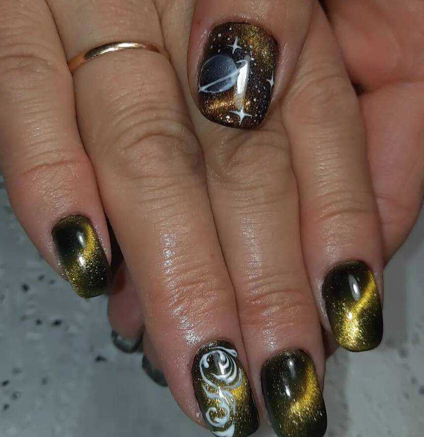 Трендом сезона 2022 будет также маникюр с металлизированным покрытием (фольга, поталь, сусальное золото). Цвет металла может быть совершенно разным, на усмотрение мастера. Сейчас применяются разные варианты, но самыми популярными на сегодняшний день являются: