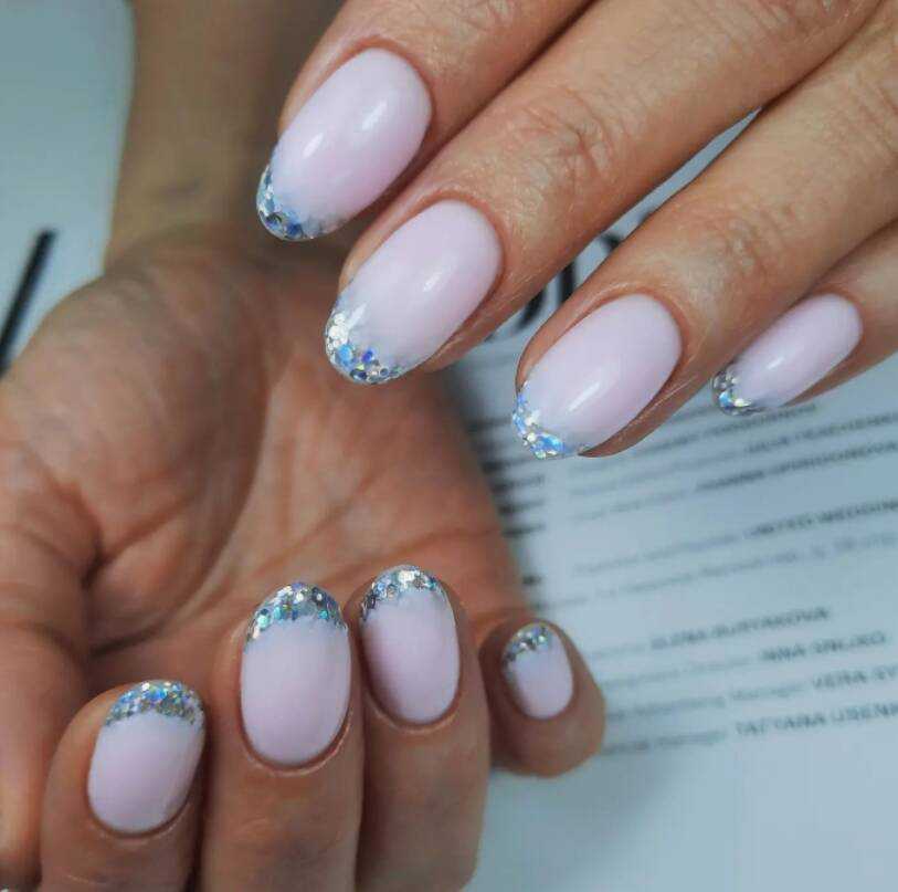 Овальна форма любит блестящий декор, который может выражаться в фольге, втирке, блестках. Все это допускается использовать на подобной длине, но не в переизбытке, чтобы не перегрузить маникюр. Выкладывать фольгу можно на одном или паре пальцев, что создаст дополнительный акцент, но не сделает внешний вид слишком броским.