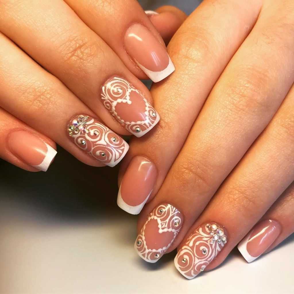 Всю ногтевую пластину покрывают лаком в нежно-розовом или телесном оттенке, затем по краю тонкой кистью рисуют орнамент белым лаком.