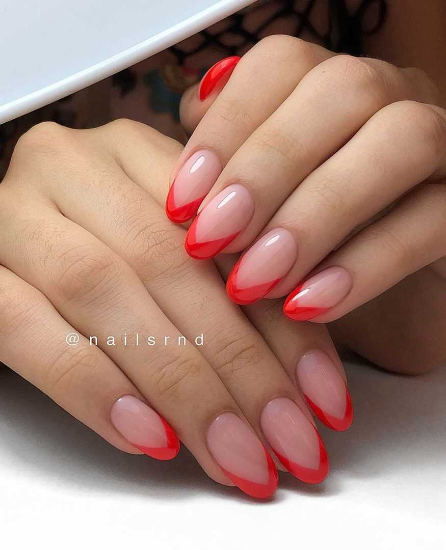 Одна из модных новинок этого сезона — это необычные новые форматы сочетания цветов для френча. Например, когда цвета меняются привычными местами, и белый цвет перемещается на основание ноготка, а линия улыбки окрашивается красным цветом. Или, когда основание ноготка полностью окрашивается красным гель-лаком, а линия улыбки — белым. Выглядит такой френч очень ярко и оригинально.