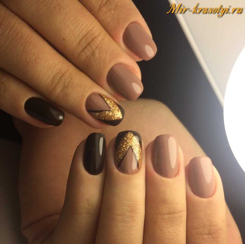 Золото и черное всегда сочетаются очень хорошо. Сегодня позолота с эффектом старения очень популярна в нейл-арте. Здесь мастер использовал нюдовый фон для основы, это классическое сочетание цветов подойдет под любую одежду.