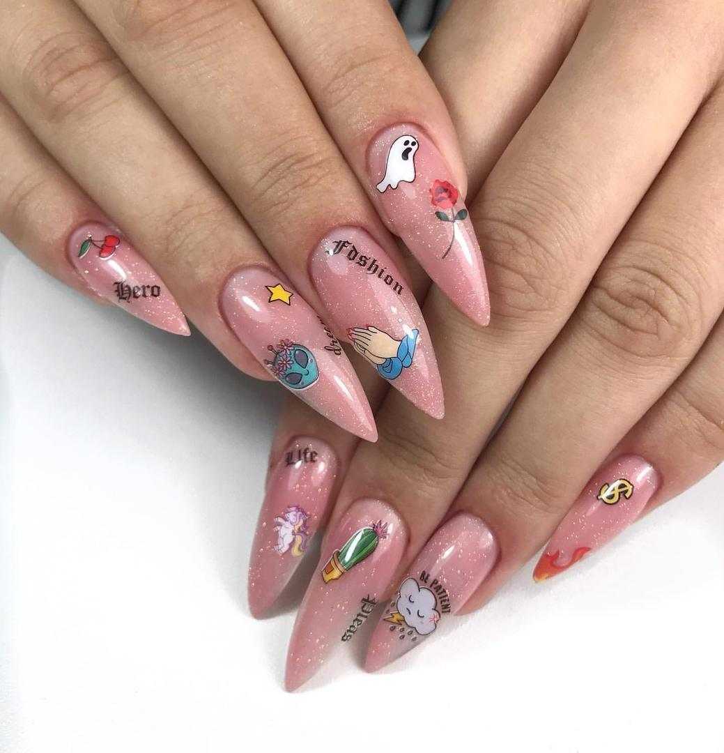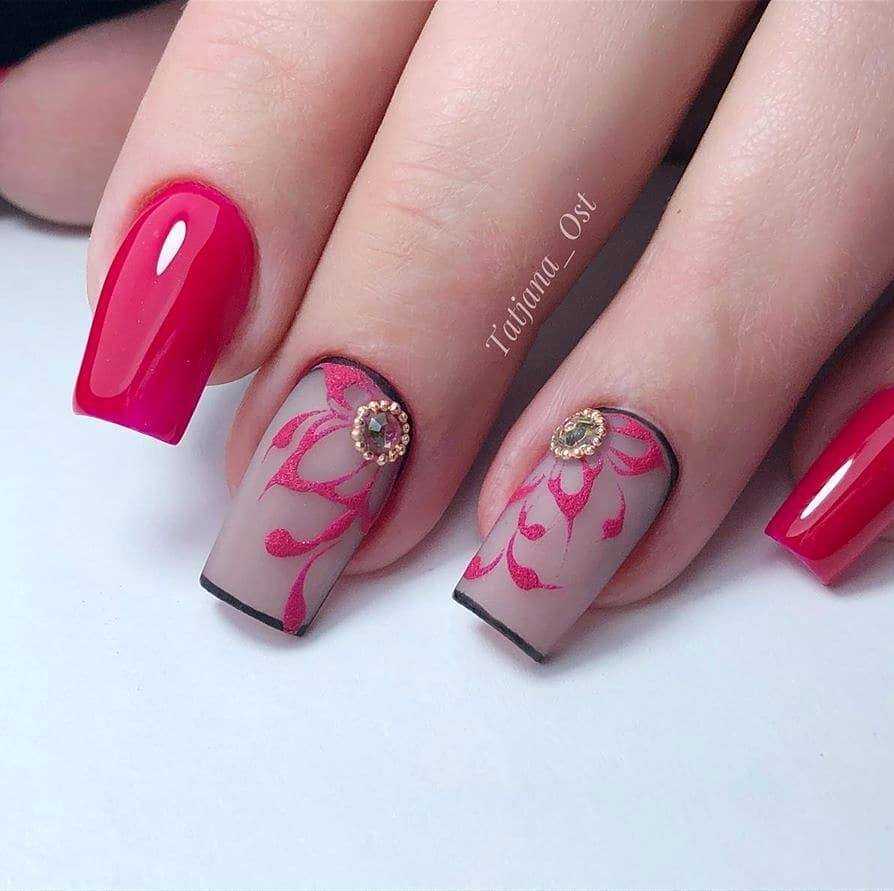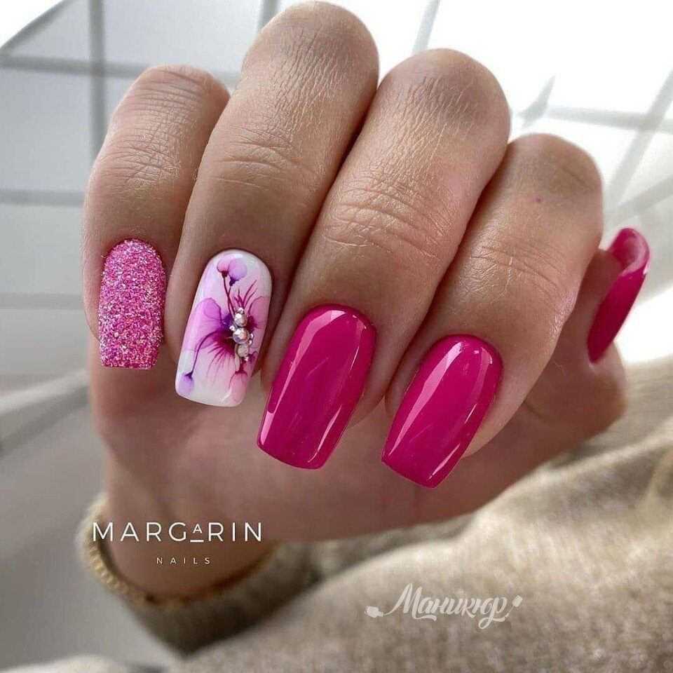 Максимально девичий вариант — розовый маникюр. Он актуален в любое время года, но летом лучше отдавать предпочтение ярким оттенкам, а зимой можно выбрать более приглушенные тона. Здесь актуален декор в виде блесток, пайеток и страз, но их лучше наносить на один или несколько пальцев, иначе ваш дизайн может показаться вульгарным.