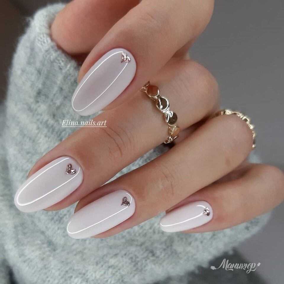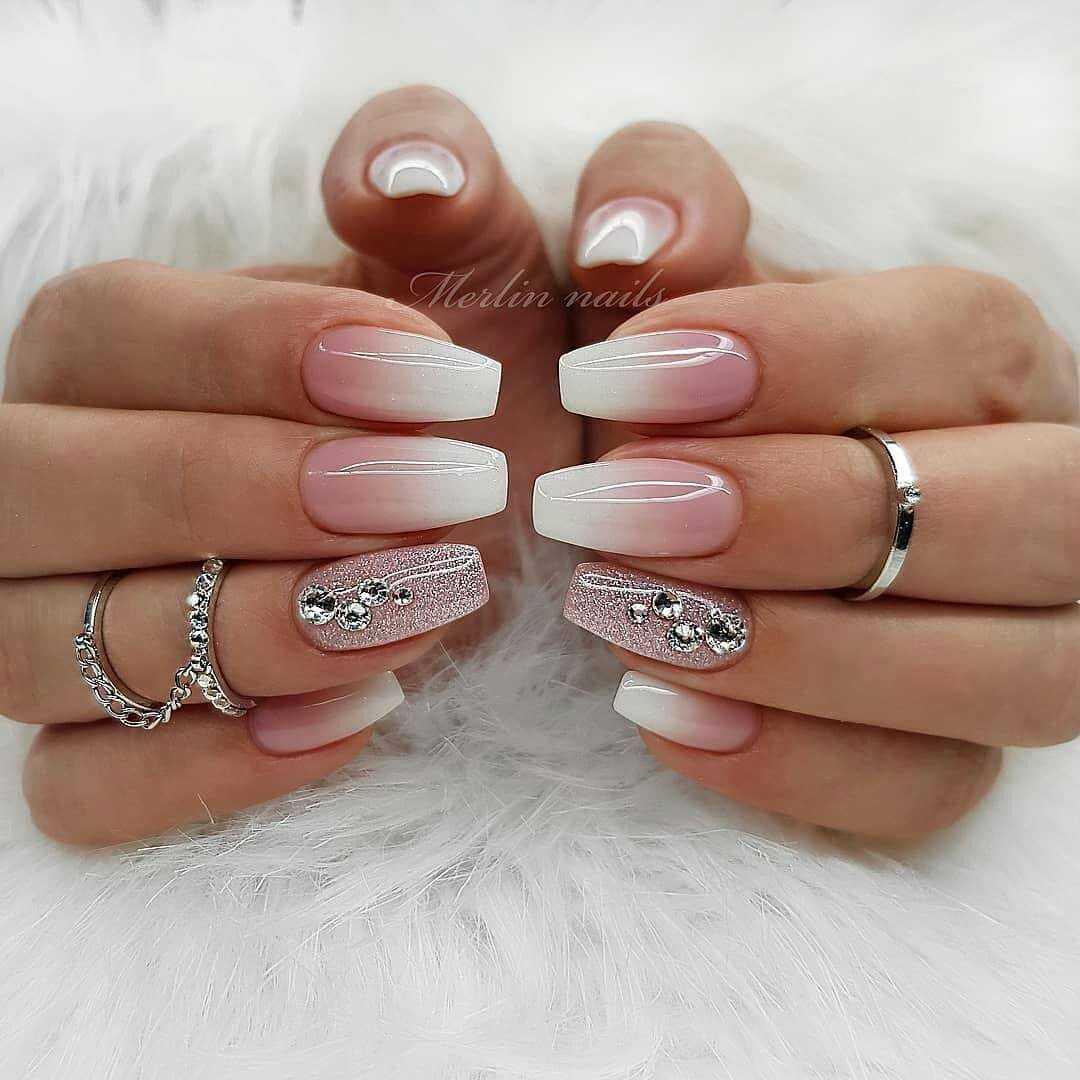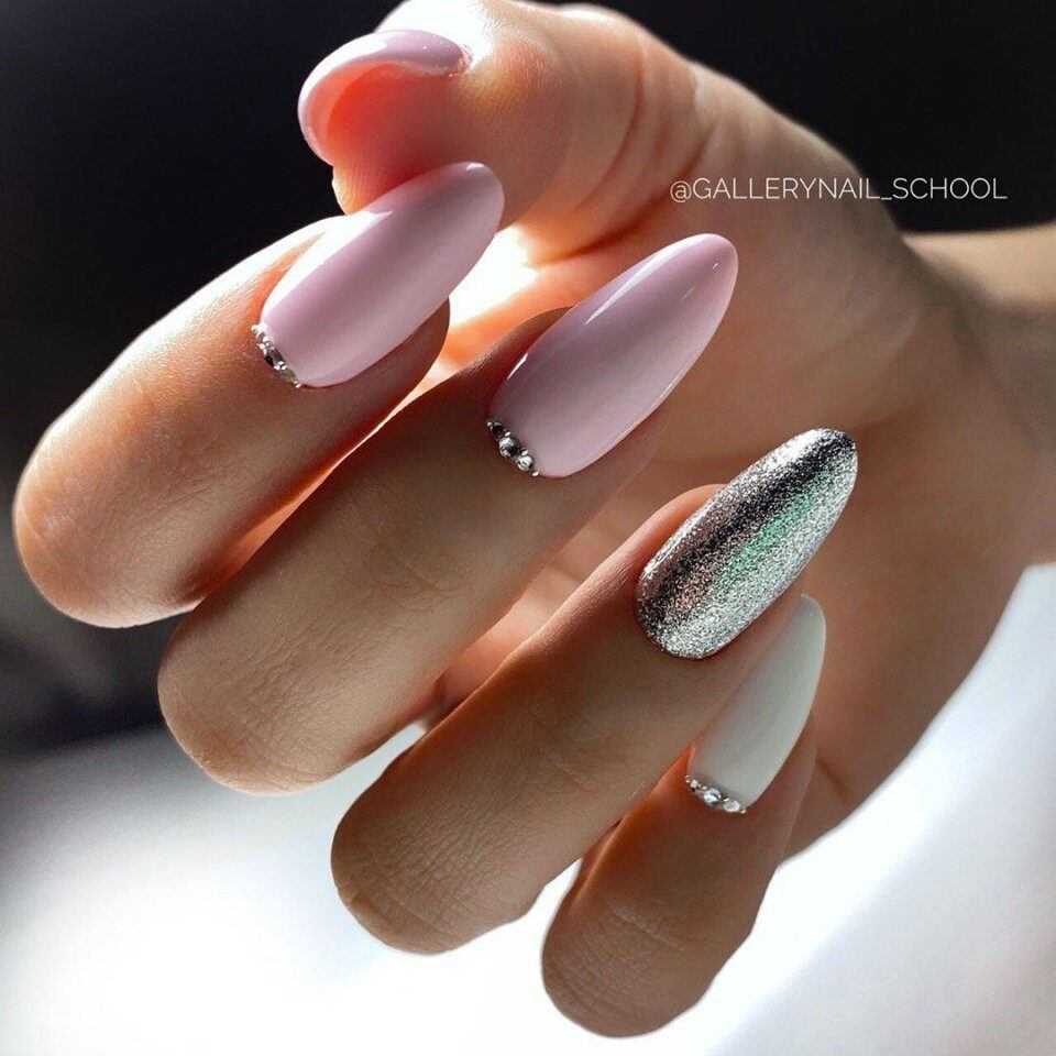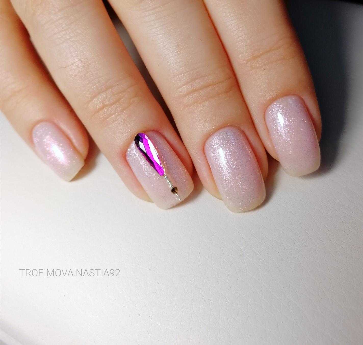 Стразы и блестки – это неотъемлемый элемент нежного маникюра. Данный декор может украсить любой дизайн, сделать его романтичнее и нежнее. Очень красиво смотрится луночка из стразов на нескольких пальчиках или россыпь декора на ноготке от большого камешка к маленькому или наоборот. При получении нежного и скромного эффекта используйте светлые тона лакового покрытия. Например, лиловый, мятный, светло-голубой, нежно-розовый, нюдовый, белый или пастельный.