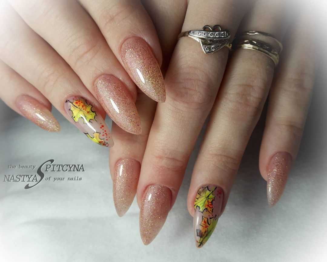 Модный осенний листик на ногтях нюдового цвета может быть абсолютно любого оттенка. В данном случае можно «поиграться» с цветовыми решениями и сделать ажурный осенний лист многогранным за счет переходов от одного колоритного оттенка к другому. Главное придерживаться грамотного цветового сочетания, от этого шага будет зависеть полнота и реалистичность итогового результата на ногтях.