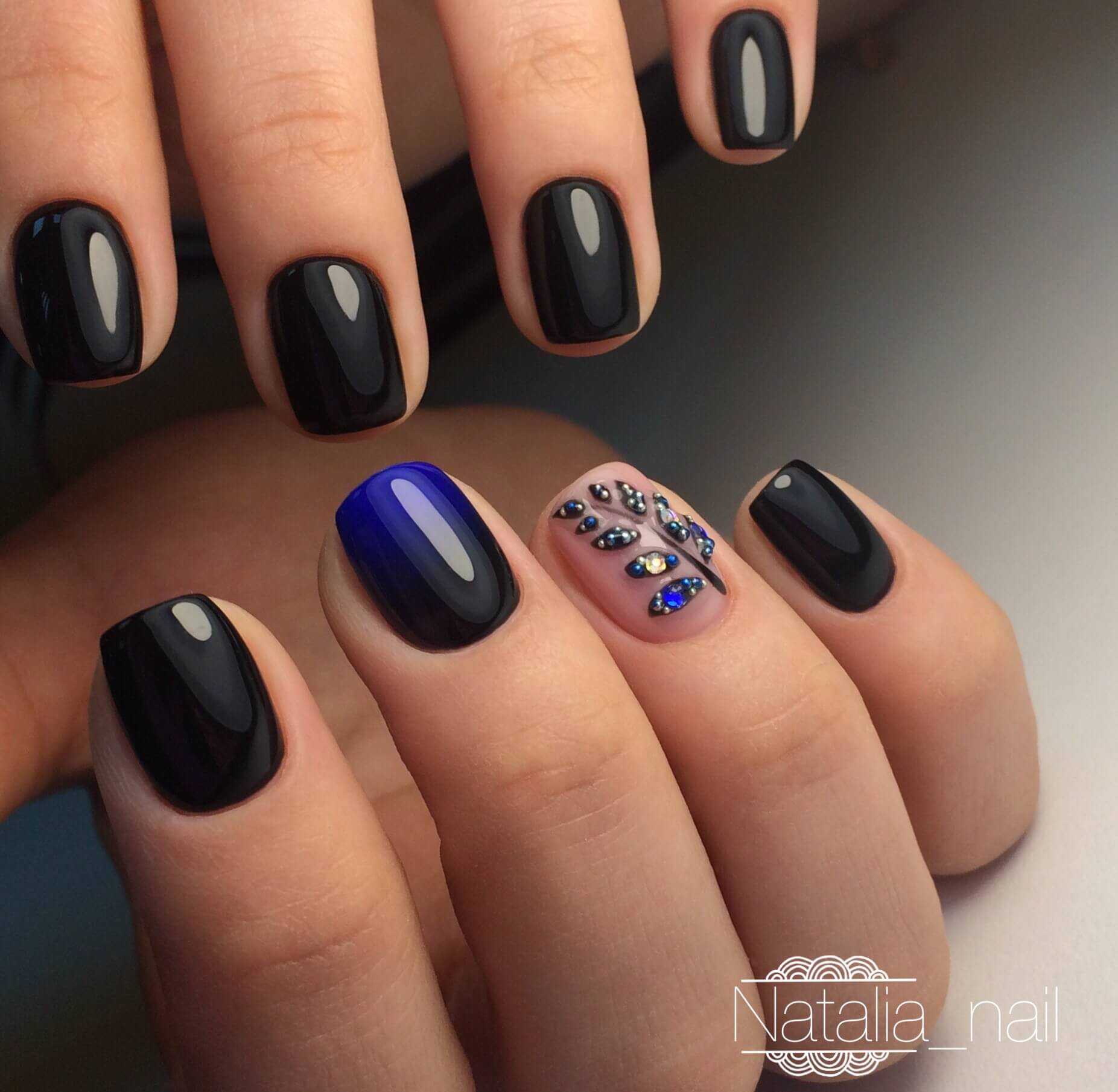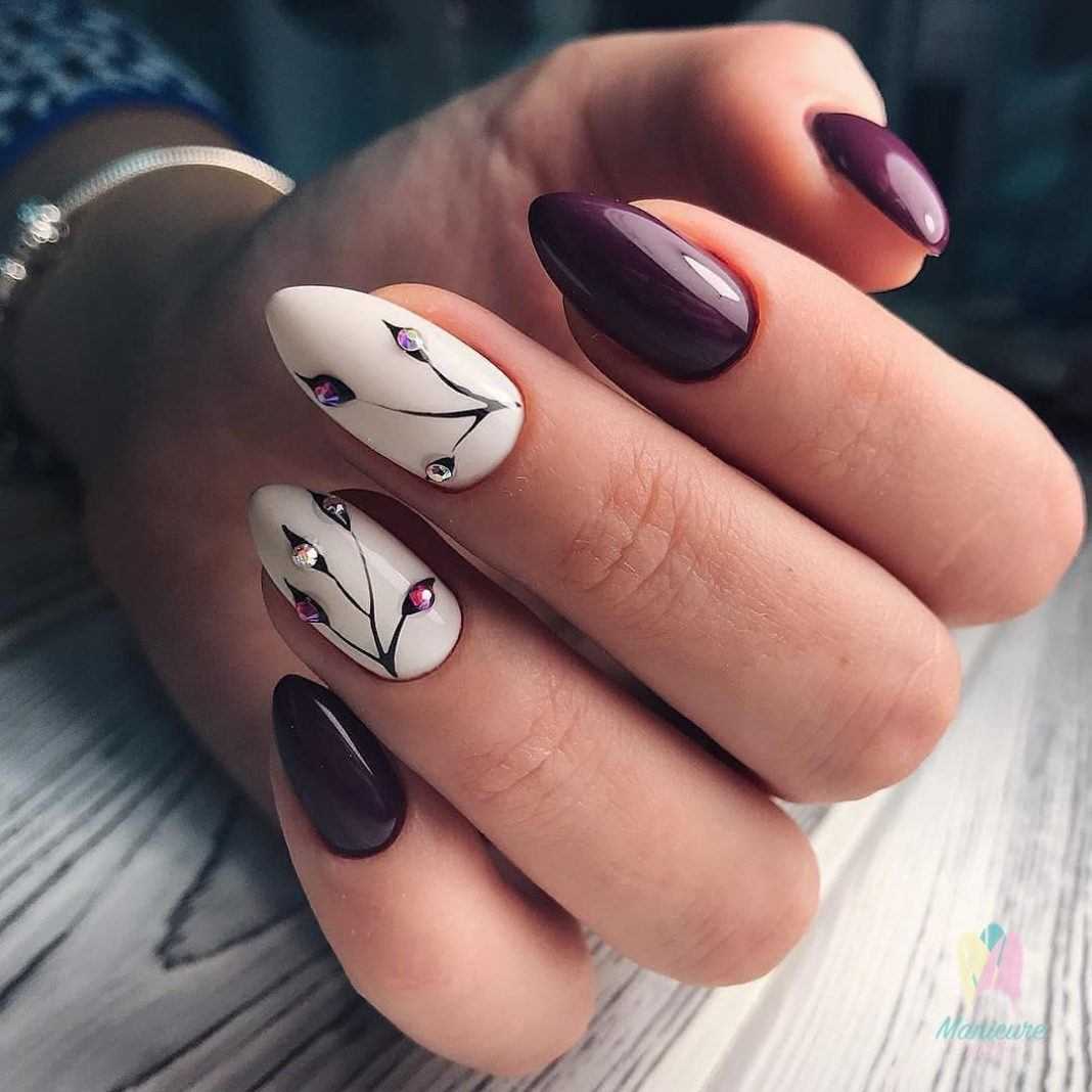 Подойдут для длинных ногтей и темные оттенки: черный, кофейный или темно-синий. Один ноготь украсьте рисунком, а другие оставьте «чистыми». Так как базовый цвет нейтрален, маникюр не будет выглядеть перегруженным.