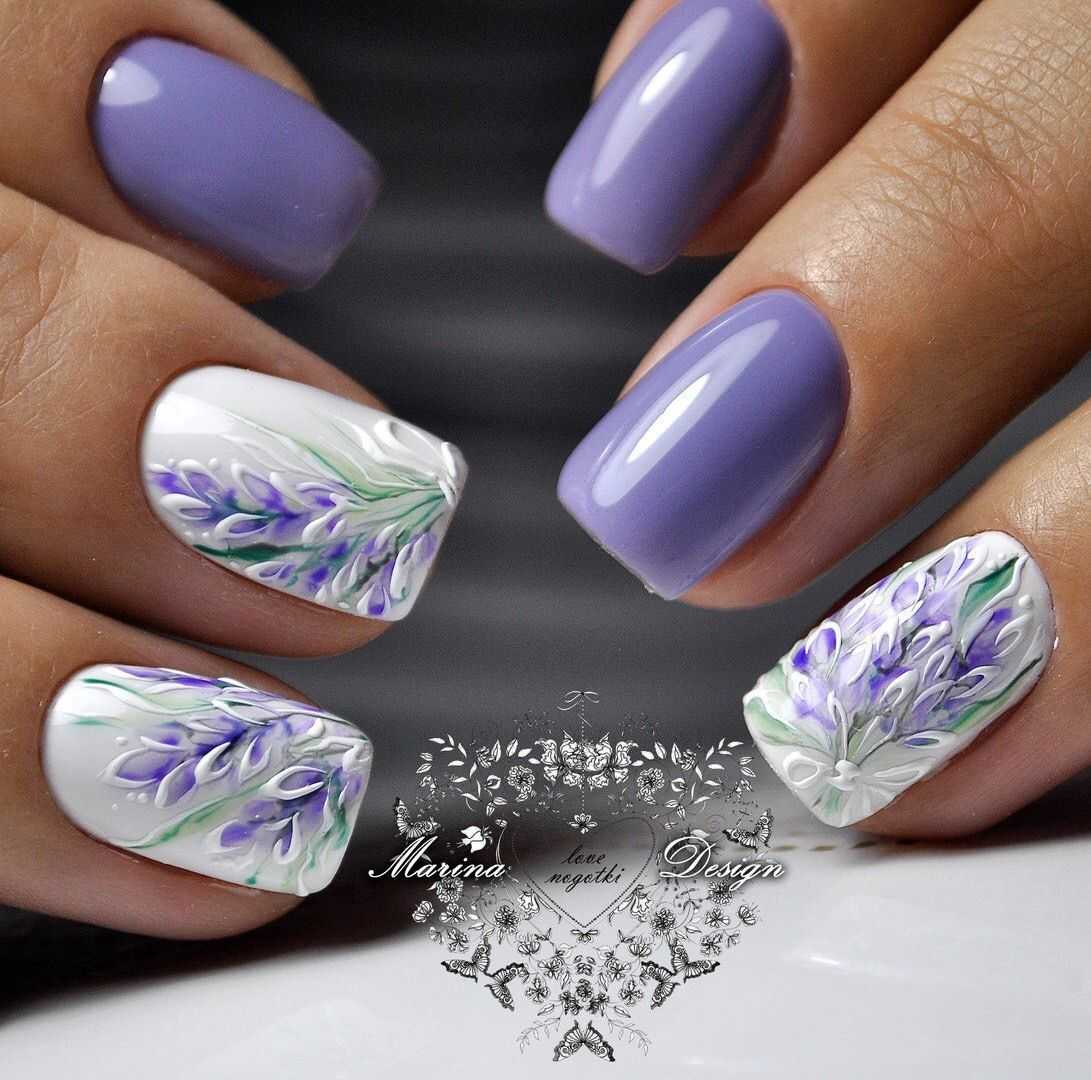Тонкие изящные веточки можно добавить на два-три ногтя или нарисовать одинаковый узор на всех ногтях. Секрет — в выборе лака. На нежном фиолетовом или розовом лаке рисуйте листья при помощи лака с блестками или глиттера. А для насыщенных ярких цветов выбирайте контрастные светлые или темные, чтобы они не «потерялись».