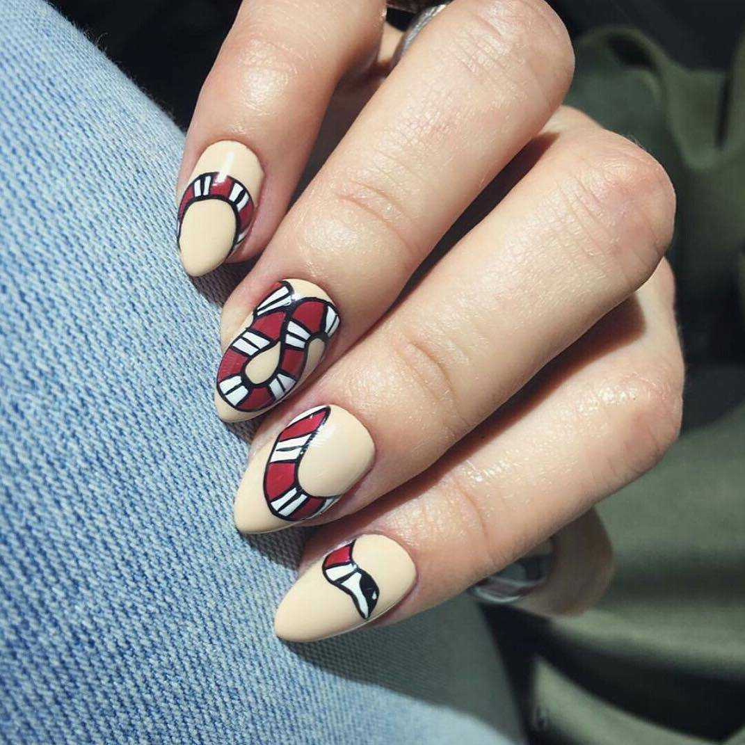 Многие девушки просят мастеров маникюра нарисовать рисунок, который с одного ногтя переходит в другой, и только когда все ногти стоят рядом, мозаика складывается в одну картину. В стиле Гуччи будет арт с длинной красно-белой королевской змеей. Согласитесь, выглядит стильно.