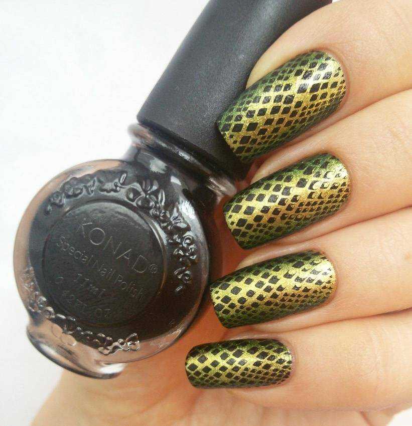 Змеиный маникюр – это шикарное дополнение женского образа. Сетка является достаточно необычным и экстравагантным средством для создания нейл-арта, поскольку есть более традиционные и легкие способы имитации змеиной кожи. Вы можете нарисовать ее с помощью тонкой кисточки или же использовать самый элементарный вариант – стемпинг для ногтей. Что бы вы ни выбрали, нейл-арт в змеином стиле будет вызывать восхищение у вашего окружения. Мы подготовили для вас несколько красивых фото, чтобы вы могли убедиться лично, насколько шикарно смотрится такой маникюр на женских руках.
