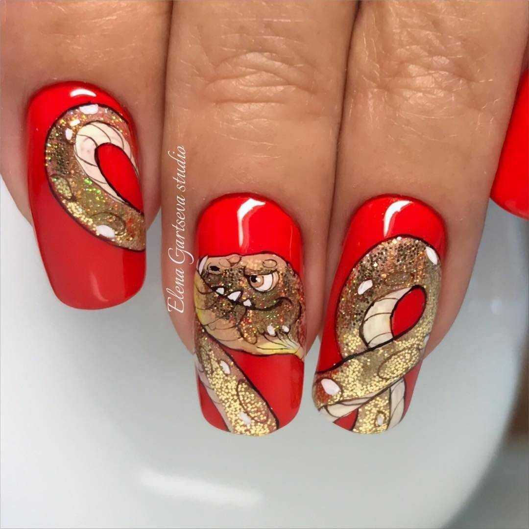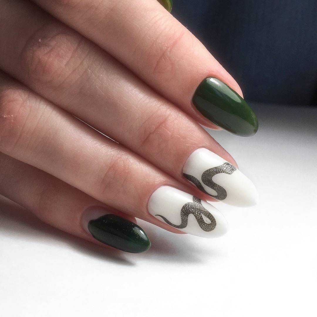 Здесь змейка тоже одна на акцентном ногте, правда в «развернутом» положении и на длиннющих ногтях. Красиво!