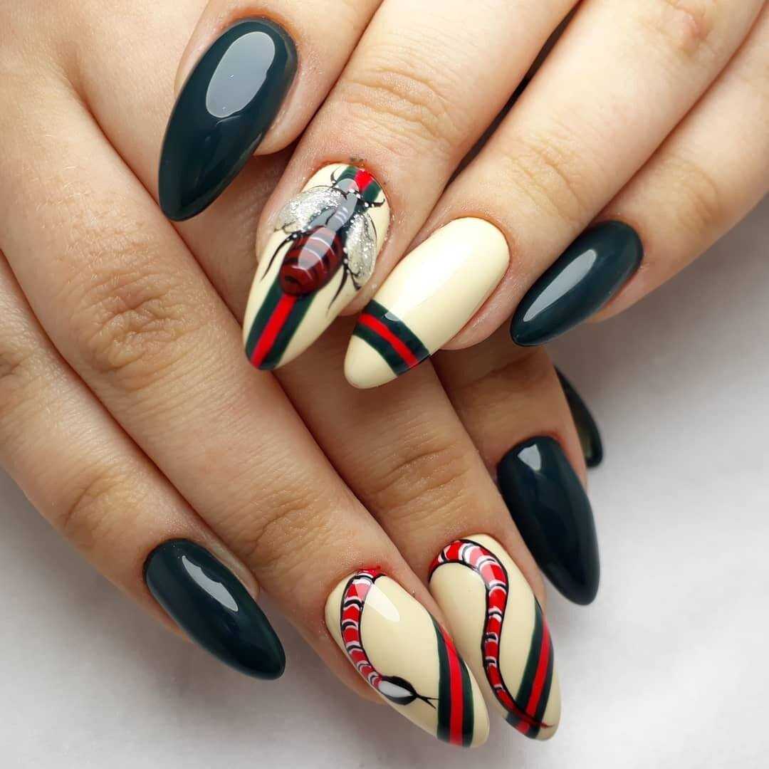 Настоящим хитом 2020 года стал маникюр в стиле известного бренда Гуччи. Одним из его символов является красная змея с бело-зелеными полосами. Для создания гармоничного дизайна нейл-мастера наносят на все ноготки такое цветовое сочетание и лишь на одном или двух рисуют змею. В некоторых случаях дополнением может быть золотистые, бежевый, черный или коричневый цвет. Что касается декоративного оформления, то различные блестки и стразы используются довольно часто. В целом такой маникюр достаточно яркий, активный. Поэтому его выбирают на каждый день и для событий, но только не для работы в офисе.