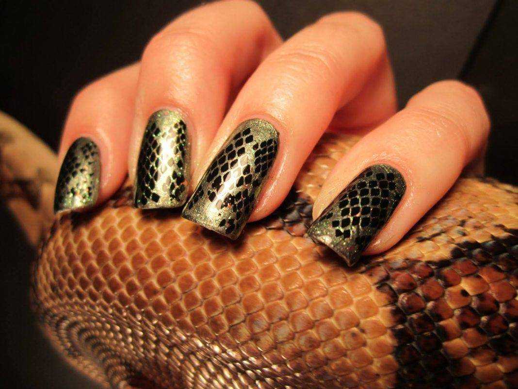 Благодаря современным материалам мастера маникюра способны создавать просто настоящие произведения искусства на ногтях, и без особого труда выполнить дизайн, максимально имитирующий кожу рептилий. Для таких целей применяются разнообразные готовые наклейки, стемпинг, элементы фольги, губки и сеточки. При помощи акрила, геля или кракелюрного лака можно украсить ноготки «настоящими» объёмными чешуйками. А фишкой в маникюре под змеиную кожу стал появившийся совсем недавно способ украшения ногтевых пластин натуральной кожей этих созданий, от которой они избавляются во время сезонной линьки. Кусочки натурального материала крепятся к ногтевым пластинам и фиксируются сверху прозрачным гель лаком. Неповторимый эффект натуральности готов!