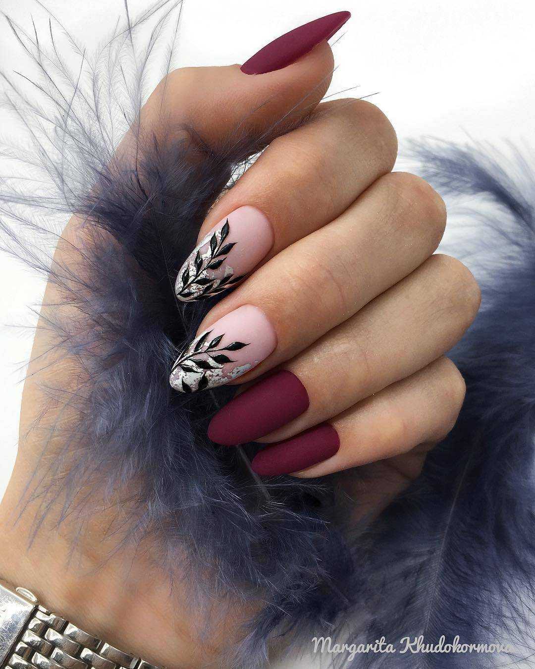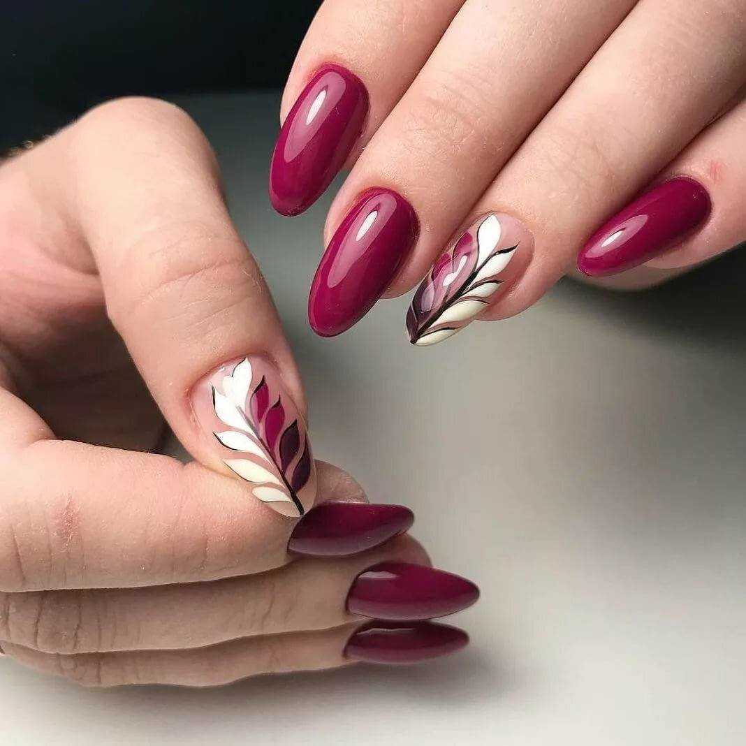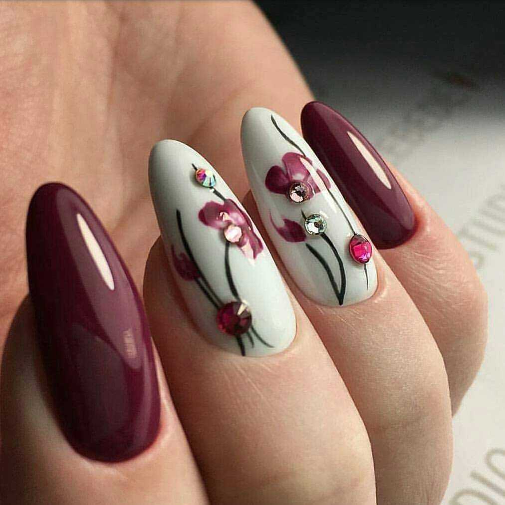 В качестве дополнительного оттенка чаще всего используется белый цвет. Он вносит в дизайн ногтей повседневные нотки, облагораживает ноготки. Используйте контрастное сочетание темно-фиолетового цвета с белым, светлые пудровые оттенки фиолетового и серые, молочные, белые тона. Помимо флористики на ногтях можно расположить полоски, кружево, надписи и другой сдержанный декор.